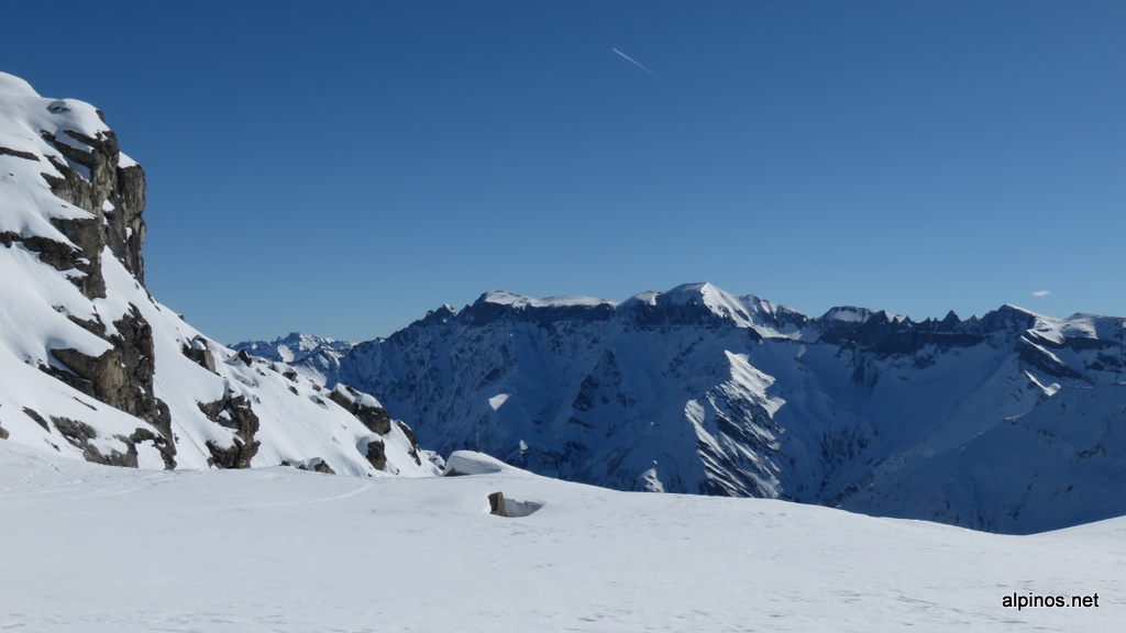 Ist schon schön, wenn die Vögel fröhlich morgens um viertel vor sieben durch den Wald pfeifen und dadurch den Aufstieg zur Skihütte Oberebs 1690m etwas abwechslungsreicher gestalten. Aber spätestens dann weiss man auch: der Frühling ist da. Am Hangegg 2002m und dem Rotstock 2329m vorbei stieg ich zügig durch den schon recht warmen Morgen. Bald querte ich hinüber zum Chärpftor und steig diesmal die Skier auf der Schulter den steilen Hang durch die Felsen hinauf auf das obere Schneefeld. Bald hatte ich das Skidepot erreicht und konnte ohne Felsberührung in gutem Trittschnee zum Gross Chärpf 2793m aufsteigen (2h35min). In der Abfahrt hielt ich mich weit rechts und suchte die sonnenexponierten Hänge. Nach kurzem Gegenanstieg zum Chärpftor zog ich durch wunderbaren Sulzschnee meine Linien hinab nach Obererbs und zurück zum Ausgangspunkt.