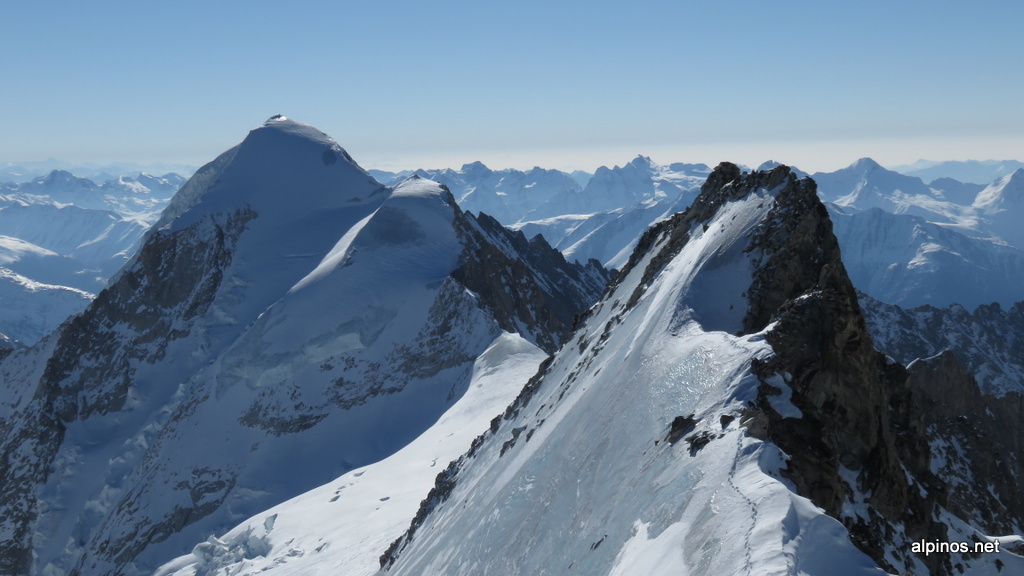Im Schein unserer Stirnlampen liefen wir über die weite Fläche des Beichgletschers in den beginnenden Morgen. Die wenigen Sonnenstrahlen, die bald in das tiefe Gletschertal drangen, verdeutlichten die Abgeschiedenheit und Schroffheit des Gebiets. Über zunächst harten, dann einigen frischen Pulverschnee stiegen wir hinauf durch den Gletscherbruch und erreichten die sonnengefluteten Weiten des oberen Gletscherbeckens des Beichgletschers. Wir drehten nach rechts ab und hatten kurz darauf die Felsen des Vorgipfels 3781m erreicht. Selbiger war schnell erklommen; nun mussten wir jedoch Steigeisen und Pickel montieren, um einige eisige Meter hinab in die Lücke zu steigen, bevor wir durch teils tiefen Schnee zum Hauptgipfel des Lötschentaler Breithorns 3785m steigen konnten.