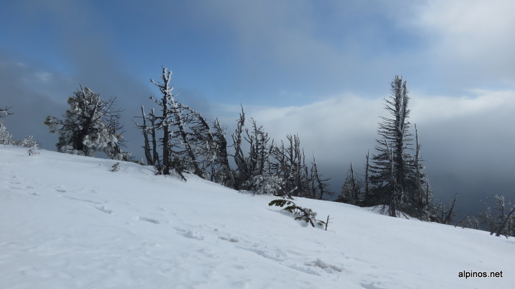 Nach dem Besuch der Painted Hills am Vormittag hatten wir uns in Sisters mit der täglichen Kaffeeration versorgt. Wir berieten eine Weile, was wir die letzten Tage unseres Urlaubs noch unternehmen könnten. Die Wetterprognose war für den Kübel und die Outdoor-Aktivitäten damit recht beschränkt. Die Pläne für Skitouren auf die grossen Vulkane hatten wir gestern bereits auf unseren legendären Latsch über die Dutchman Flat begraben. Beim Blättern durch den Lonely Planet fand wir einen kleinen Hügel: den Schichtvulkan Black Butte. Immerhin 1963 m hoch und sogar mit eigenem Wikipedia-Eintrag. Wir brauchten zwei Anläufe, bis wir in dem Wegegewirr rechts des Highways 20 die richtige Abzweigung fanden und über die Forststrasse den Parkplatz erreichten. Ausser zwei lustigen Squirrels, die eifrig umhersprangen, war niemand zu sehen (obwohl das Wetter gar nicht so schlecht war, der Regen hatte aufgehört und die Wolken wurden etwas weniger dick…). Auf dem breiten Wanderweg ging’s teils recht steil nach oben. Bald tauchten wir in die Wolkendecke und stapften zum Schluss durch knietiefen Schnee zum Feuerwachturm hinauf. Für einige Momente riss die Wolkendecke auf und wir konnten die beeindruckenden Eisformationen am Turm bewundern. Wieder am Auto freuten wir uns über die kleine Wanderung und den ersten «Berg», den wir in diesem Urlaub bestiegen hatten. Vielleicht ergab sich ja doch noch etwas…