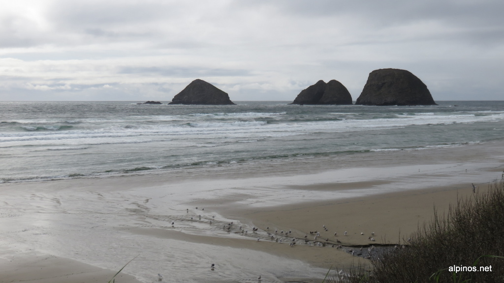 Das Thema des Morgens: Wasser. Wasser von oben, Wasser von unten, Wasser horizontal wahlweise von rechts oder links oder frontal. Erstaunlich, wie viel Wasser vom Himmel fallen kann… Aber es gab heute auch weniger nasse Phasen und die erste am Vormittag nutzten wir zunächst für einen Ausflug zur Cape Perpetua Scenic Area etwas südlich von Yachats. Zunächst schlenderten wir auf dem Cook’s Ridge & Gwynn Creek Loop Trail sechs Meilen durch einen völlig durchfeuchteten Wald (grading: moderate). Immerhin schützte das Blätter- und Nadeldach etwas vor dem Regen. Anschliessend bewunderten wir das Spouting Horn und die Brecher an der Felsküste – gab nette Bilder, sonst hat uns das jetzt nicht so umgehauen, die Wasserfontänen. Anschliessend fuhren wir entlang der Küste in zunehmend besserem Wetter entlang weiter nach Norden. Beim Nestucca Bay National Wildlife Refuge verliessen wir die Interstate 101 und fuhren auf der Brooten Road nach Pacific City und weiter über Sandlake nach Netarts. Hübsche Bucht hier mit Felsen und etwas weiter das malerische Cape Meares Lighthouse samt Steilküste und Vogelkolonien. In Tillamook trafen wir wieder auf die Interstate 101 und fanden schliesslich in Bayside Gardens kurz vor Manzanita eine Unterkunft für die Nacht. Das Highlight hier: Kolibris, die sich an einer Futterstelle versorgten – tolle Vögel.