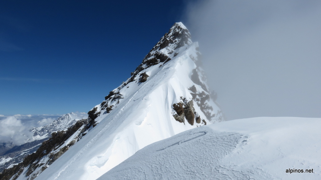 Um ca. viertel nach fünf verliessen wir die Monte-Rosa-Hütte 2795m in den noch trüben Tag. Nachdem sich die morgendlichen Graupelschauer verzogen hatten erstrahlte der Tag zwar in seiner vollen Pracht und die Sonne erleuchtete mit ihren warmen Strahlen die umliegenden Berggipfel – nur leider nicht uns. Der Anstieg über den Monte-Rosa-Gletscher liegt bis in den Vormittag im tiefen Schatten und bald stapften wir dick eingepackt durch die eisige Kälte. Auf ca. 4000 m auf der Satteltole verliessen wir die frische Spur hinüber zum Sattel 4356m und querten, verblasenen Spuren folgenden, von rechts kommend in den Serac. Den ersten grossen Riss, der quer über fast die ganze Breite des Gletschers läuft, querten wir steil in drei Spitzqueren auf der äussersten rechten Seite. Dann wühlten wir uns durch ca. 1 m schweren Pulverschnee zum Eiskanal, der den Weg durch den zweiten Abbruch erlaubt. Mit etwas Mühe befreiten wir die stabile Eiszunge vom Triebschnee und konnten so, die Frontzacken der Steigeisen voran, in den Eiskanal gelangen. Nach etwa 20 m standen wir wieder im flachen Gelände und erreichten bald darauf den Silbersattel 4515m. Rechts über uns turnten einige Bergsteiger bereits zum Gipfel der Dufourspitze. Pickel und Steigeisen waren auf dem weiteren Weg kein Luxus: der Grat bestand mehr aus Eis als aus Firn. Der Blick hinab zur mehr als 2500m unter uns liegenden Alpe Pedriola war eher abstrakt denn real, aber mahnte zur Vorsicht. Eine gefühlte Ewigkeit später hatten wir die leicht verschneiten Gipfelfelsen erreicht und nach insgesamt 6h30min hatte der lange Weg zum Nordend 4609m ein Ende.