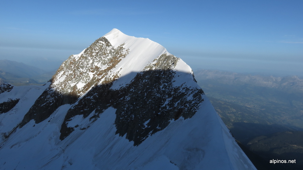 Um 3:45 Uhr traten wir aus dem Refuge Durier 3356m hinaus in die sternklare Nacht und begannen unseren Aufstieg. Über eine steile Firn-Geröll-Rampe erreichten den ersten schmalen Firngrat, der uns an die Felsschulter führte, die wir in einfacher Kraxelei überwanden. Auf dem Bosse-Grat waren bereits die ersten Stirnlampen der Bergsteiger zum Montblanc zu sehen, als wir über einen zweiten schmaler Firngrat die Felsbastion erreichten (1h30min). In der beginnenden Dämmerung kletterten wir über die soliden und trockenen Felsen immer entlang der Steigeisenkratzer in mehreren kleinen Aufschwüngen hinauf. Die Schlüsselstelle (4a) kam uns nicht so schwer vor wie die ersten Meter der Kletterei, war aber trotzdem recht interessant zu klettern. Über leichtere Felsen erreichten wir den steilen Gipfelfirn und standen um 7 Uhr auf dem Gipfel der Aiguille de Bionnassay 4052m (3h15min). Wir genossen den Augenblick und den herrlichen Blick hinüber zum Montblanc. Vom Gipfel wanderten über den wirklich sehr ausgesetzten und teils ziemlich schmalen Firngrat hinab in den Col de Bionnassay 3888m und hinauf zum Piton des Italiens 4002m. Dank des neuen Schnees der letzten Tage war das Gehen in der guten Spur angenehm und es gab nur eine kurze eisige Stelle kurz oberhalb des Cols. Über einen weiteren Firngrat ging’s steil hinauf zu P.4154 und schliesslich zum Dôme du Goûter 4304m (5h vom Refuge). Der Tag hatte ja kaum begonnen und der Tank noch nicht leer. Also wanderten wir auf der teils mehrspurig ausgebauten Aufstiegsspur vorbei am Refuge Vallot 4362m, über Les Bosses 4547m hinauf zum höchsten Punkt des Montblanc 4810m (1h40min).