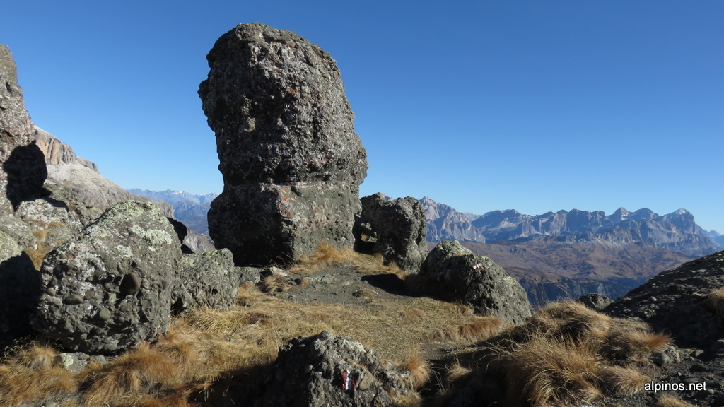 Zum Abschluss unseres Wanderausflugs in die Dolomiten liefen wir vom Lago di Fedaia 2054m auf dem Bindelweg 601 am Rif. Viel dal Pan vorbei zum Rif. Baifa Frederoia 2388m. Hier verliessen wir den breiten Wanderweg und wanderten genüsslich über den teils sehr schmalen Grat über Col de Cuch 2563, Sas Ciapel 2557, Le Forfesc 2585m und Belvedere 2620m hinüber zum Rif. Parta Vescovo 2478m. Der Weg war nicht immer offensichtlich, zum Sas Ciapel gab es eine anregende Kletterpassage, zum Le Forsesc ging’s durch eine steile Gras-Schotterflanke hinauf: also genug Spass für eine Reha-Wanderung. Der Abstieg über den gerölligen Weg 698 hinab zum See war leider wenig angenehm, aber war bei einem Eisbecher auf der sonnigen Terrasse des Rif. Seggiova bald wieder vergessen.