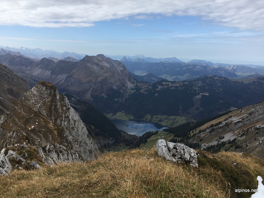 Nach einem gemütlichen Start um 8:45 Uhr bei P.922 am Ziggenbach stiegen wir an der Hohfläsch-Hütte 1368m vorbei und über den SSW-Rücken hinauf zum Schiberg 2043m. Wir querten das Furgge 1904m und standen kurz darauf auf dem Plattenberg 2081m. Weiter ging’s an der Gratkante entlang bis zum markanten Abbruch, den wir über ein Grasband nach rechts hinab umgingen. An der Mürli vorbei erreichten wir den N-Grat des Brünnelistocks und standen nach wenigen Minuten auf dessen Gipfel. Anschliessend überschritten wir noch den Rossalplispitz 2075m, bevor wir aus Zeitgründen über die Rossalpeli und Hohfläschen wieder an den See abstiegen. Herrliche Grat- und Kraxeltour in herbstlichem Ambiente.
