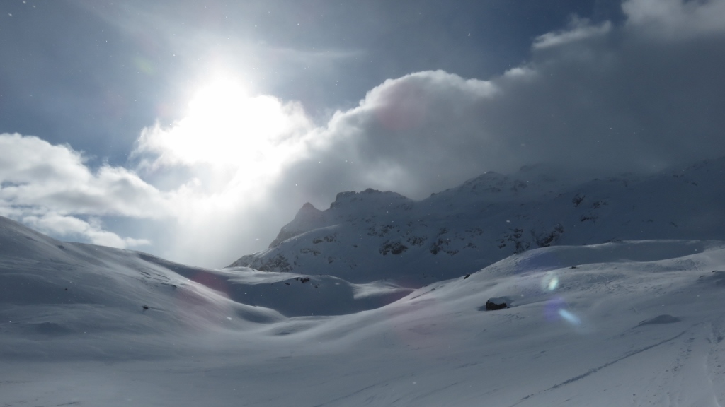 Immerhin war der Schnee gut – soweit das Fazit der Tour. Von Plaun da Lej 1798m waren wir am Weiler Grevaselvas vorbei hinauf gestiegen. Die Wolken quollen von Norden über die Berge, ab und zu wurden wir in dichten Nebel gehüllt. Bis zum Lej Nair rissen die Wolken aber immer wieder auf. Auf ca. 2700m wurden gewannen die Wolken gegen die Sonne und wir entschlossen uns zur Umkehr. Immerhin war der Schnee in der Abfahrt gut…