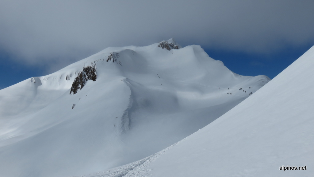 Ok, der Titel ist geklaut, ich gebe es zu! Und zwar von dem Skitourengeher, der mit seinem Kollegen nach mir am Gipfel ankam und seinen Gipfelerfolg unverzüglich, etwa 31 Sekunden nach dem Absitzen, mit diesem geistreichen Kommentar in den sozialen Medien posten musste (ob er wohl den ganzen Aufstieg an diesen Worten gefeilt hatte?). Wie schön ist doch die Bergwelt im Jahr 2018… wie auch immer… jedenfalls war ich nicht ganz undankbar, weil die beiden Herren vom Passo San Giacomo eine Spur – etwas eigenwillig zwar und wenig an den Vorgaben des Geländes orientiert, aber immerhin eine Spur – bis unter P.2618 gelegt hatten, bevor sie mir überliessen, den eingeblasenen Hang zum Gipfel hinauf zu wühlen. Die Bise blies kalt von Norden herüber, vertrieb aber zumindest die restlichen Wolken, die sich um das Marchhorn und den Basòdino gehalten hatten. Weitere Tourengeher waren bereits angekommen und weiter unten marschierten die Kolonnen auf den Berg zu, so machte ich mich an die Abfahrt – schnee-technisch ein Desaster: erst windgepresst, dann ca. 50m Pulver bei der Einfahrt ins Valle Rossa, dann Regenkruste vom feinsten. Herrlich! Mit brennenden Oberschenkeln kam ich an der Passstrasse an und genoss die vergleichsweise angenehme Fahrt über zahlreiche Schneeschuhlöcher und etwas Firn nach All’Aqua. Übrigens: im Aufstieg erkannte ich das Val d’Olgia kaum wieder: es lieg momentan so viel Schnee im Gebiet, dass fast alle Büsche und Unebenheiten im Gelände zugedeckt sind und der Aufstieg ein Genuss ist – im Gegensatz zu manchem Aufstieg in den vergangenen Jahren…