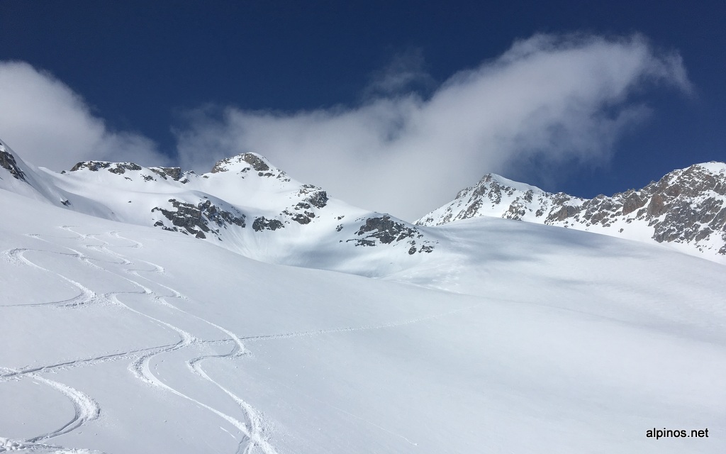 Das Wetterszenario der letzten Woche wiederholte sich: Traumwetter in der Mitte der Woche, zum Wochenende wieder eine Kaltfront. Zum Glück war der Freitag recht passable gemeldet, und so zogen wir wieder zu dritt ins Bedretto. Bei überraschend wolkenlosen Himmel starteten wir um 8:15 Uhr in All’Aqua 1614m und stiegen entlang des tief eingeschneiten Ri dell’Aqua zur Capanna Piansecco 1982m hinauf. Auf dem anschliessenden Geländerücken wurden wir vom kalten Nordwind durchgeblasen, bevor wir durch den steilen Hang unterhalb P.2349 querten. Nun zogen wir unsere Spur durch die weiten Hänge der Alpe Nuova hinauf zum Passo di Rotondo 2754m, wo uns zeitweise wieder der kalte Nordwind ins Gesicht blies. Kurz darauf hatten wir den Einstieg ins Couloir erreicht und legten noch einige Spitzkehren durch den tiefen Schnee. Weiter ging’s mit aufgeschnallten Skiern durch den ziemlich tiefen und anstrengenden Schnee bis auf den Grat und in wenigen Minuten über leicht eingeschneite Felsen zum Gipfel des Pizzo Rotondo 3192m. Aus Norden drücken bereits erste Wolken der angekündigten Kaltfront herüber und wir stiegen wieder zurück zum Skidepot. Nun ging’s erst steil hinunter durch das Couloir und anschliessend über die weiten Hänge in leicht buttrigen Schnee mit teils krustiger Unterlage hinab ins Tal.