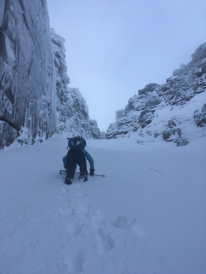 Die Black Spout-Rinne ist ein beeindruckender Schlauch, eingeklemmt zwischen schwarzen Felswänden, der in ca. 200 hm bei einer durchschnittlichen Steigung von 40-45 Grad von Nordosten auf den Gipfel des Lochnagar führt. Der Schnee in de Rinne war größtenteils guter Trittschnee, immer wieder galt es auch eine Wühlschneepassage zu bezwingen. Auf halben Weg verzweigt sich die Rinne – wir wählten die rechte, flachere und wie sich herausstellen sollte weniger verwechtete Variante. Kurz unterhalb des Ausstiegs zwang uns die magere Schneelage zu einem Zickzack über gefrorenes Gras, Felsen und Eis bevor wir eine abschließenden Aufschwung auf das Gipfelplateau des Lochnagars queren konnten.