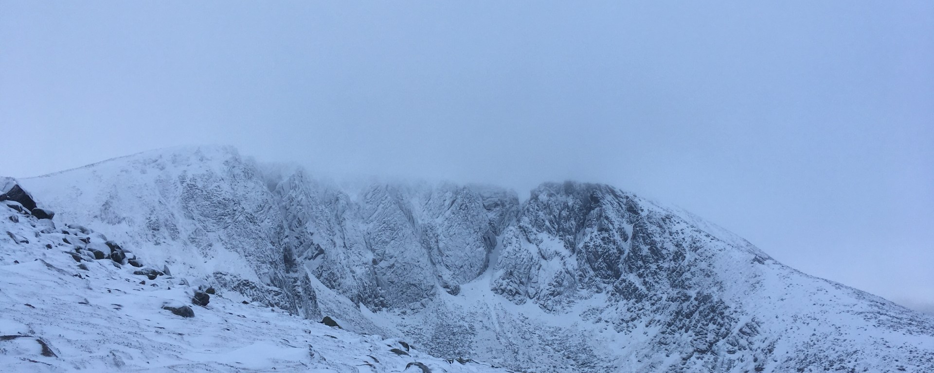 Die Black Spout-Rinne ist ein beeindruckender Schlauch, eingeklemmt zwischen schwarzen Felswänden, der in ca. 200 hm bei einer durchschnittlichen Steigung von 40-45 Grad von Nordosten auf den Gipfel des Lochnagar führt. Der Schnee in de Rinne war größtenteils guter Trittschnee, immer wieder galt es auch eine Wühlschneepassage zu bezwingen. Auf halben Weg verzweigt sich die Rinne – wir wählten die rechte, flachere und wie sich herausstellen sollte weniger verwechtete Variante. Kurz unterhalb des Ausstiegs zwang uns die magere Schneelage zu einem Zickzack über gefrorenes Gras, Felsen und Eis bevor wir eine abschließenden Aufschwung auf das Gipfelplateau des Lochnagars queren konnten.