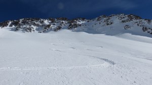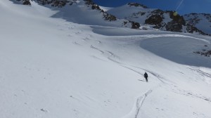 Unterhalb des Gipfels stiegen wir auf die Skier und fuhren durch den teils windgepressten, teils vereisten Schnee in der Westflanke hinab zum Verbindungsgrat nach Norden. Wieder wurden die Skier an den Rucksack montiert und wir liefen durch überraschend guten Trittschnee hinüber zur Scharte P.2912. In zwei Schwüngen fuhren wir hinab auf den Bächenfirn und stiegen anschliessend die verbleibenden 50m hinauf zur Scharte am oberen linke Ende des Gletschers (1h vom Gipfel des Bächenstocks). Auf den Zwächten hatten wir keine Lust mehr und so machten wir uns an die Abfahrt. Der Schnee der Rampe war recht wechselhaft (Presspulver, eisige Platten und Winddeckel); dann konnten wir in die Nordhängen queren und wir zogen unsere Spuren in den völlig unberührten Talkessel des Rossfirns hinab. In den Schattenhängen links lag noch gut zu fahrender Presspulverschnee. Nach der Querung konnten wir wie vor einigen Wochen die unberührten Hänge des Rossplangg geniessen. Nur der untere Teil war mit einigen Schneebröseln übersäht und schon etwas aufgeweicht – das störte aber nicht. Zufrieden und glücklich düsten wir das Tal hinaus zurück zum AlpinoMobil, das immer noch alleine auf der Strasse sass. Was für ein Tag!