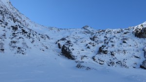 Nach einem Ruhetag starteten wir heute um kurz vor sieben in die Dämmerung des Meientals. Vom Parkplatz unter der Kirche in Meien 1313m rutschten wir hinunter zur Brücke und begannen auf schon vorhandener Spur den Aufstieg am Mületobel entlang hinauf zum Kartigel. Der Rücken, auf dem die Spur üblicherweise verläuft, war recht abgeblasen und etwas nervig zu begehen (vielleicht müsste mal jemand die ganzen unnötigen Büsche entfernen), doch bald wurde der Schnee besser und wir stiegen zügig bergan. Nach 2h schwenkten wir nach Süden und liefen den steilen Gletscher hinauf zum Skidepot. Durch guten Trittschnee ging’s hinauf auf den Grat und nachdem wir uns durch die anregende Geröll-Felsen-Lockerschnee-Kombination gekämpft hatten, standen wir auf dem höchsten Punkt des Rohrspitzlis 3219m (3h30min).