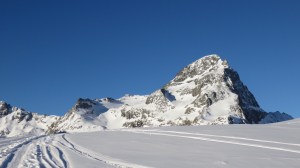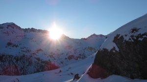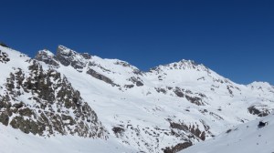 Die Aussicht auf die umliegenden Berge war herrlich und ich genoss die warme Sonne und die klare Luft. In der Abfahrt hielt ich mich rechts in den Schattenhängen und konnte so noch einige Schwünge durch den gepresstem Pulver ziehen. Ein kühler Wind machte den Gegenanstieg zurück zum Sattel P.2440 recht angenehm und kurz darauf düste ich – je nach Exposition – durch gepressten Pulverschnee bzw. frischen Sulzschnee. Fröhlich zog ich die letzten weiten Bögen die Staumauer hinunter und traf wieder am Ausgangspunkt ein, wo das Alpino-Reisemobil schon ungeduldig wartete.