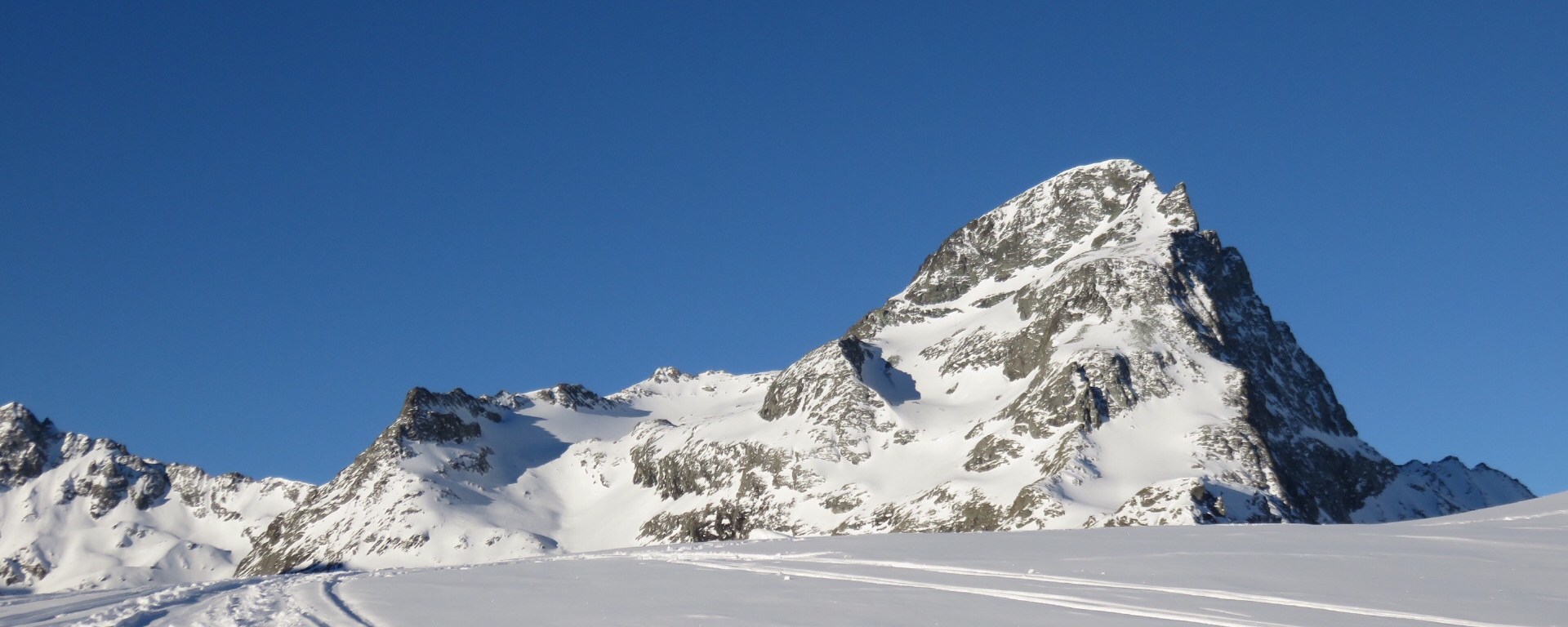 Die Aussicht auf die umliegenden Berge war herrlich und ich genoss die warme Sonne und die klare Luft. In der Abfahrt hielt ich mich rechts in den Schattenhängen und konnte so noch einige Schwünge durch den gepresstem Pulver ziehen. Ein kühler Wind machte den Gegenanstieg zurück zum Sattel P.2440 recht angenehm und kurz darauf düste ich – je nach Exposition – durch gepressten Pulverschnee bzw. frischen Sulzschnee. Fröhlich zog ich die letzten weiten Bögen die Staumauer hinunter und traf wieder am Ausgangspunkt ein, wo das Alpino-Reisemobil schon ungeduldig wartete.