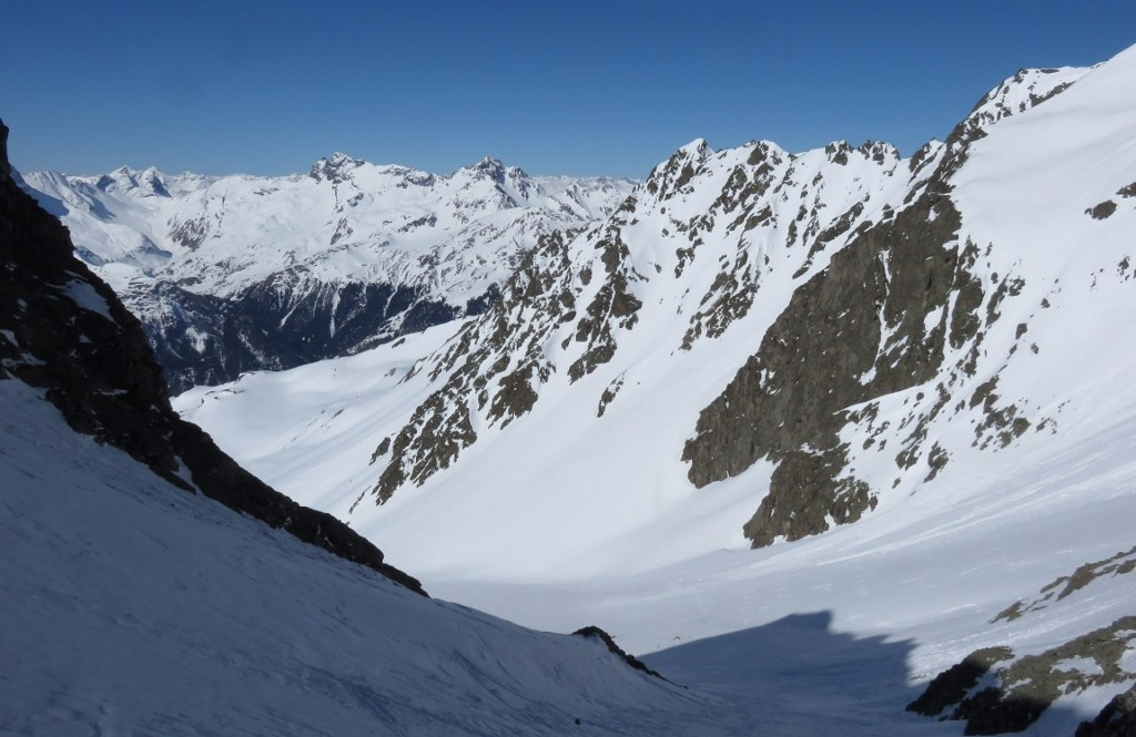 Gut ausgeschlafen startete ich um um 5:50 Uhr vom Parkplatz bei der Kirche in Sur 1619m und stieg über die noch mit harten Schnee bedeckten Wiesen zum Forstweg hinauf, auf dem ich bequem zur Alp Flix hinauf lief. Auf dem Plateau blies mir ein zunehmend starker und kalter Wind entgegen, so dass ich im Aufstieg jenseits von Tigias 1975m die Hardshell-Jacke montieren musste. Zügig ging’s weiter in den weiten Talkessel zwischen Piz Cucarnegl und Tschima da Flix hinein und bald darauf stieg ich zahlreichen Kehren das gut eingeschneite Couloir hinauf in die Sonne (Harscheisen waren auf dem sehr harten Schnee kein unnötiger Luxus). Gemütlich marschierte ich an P.3164 vorbei und die letzten Meter hinauf auf den höchsten Punkt des Piz Calderas 3397m.