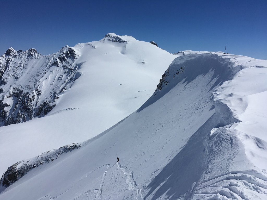 Die Ruhe währt allerdings nicht lange: Nach einigen Minuten der Ruhe kommt die erste 4er-Gruppe von der Hütte mit viel Getöse am Gipfel an. Nachdem einer der Neuankömmlinge lautstark eine seiner Heldengeschichten zum Besten gibt, ergreifen die Alpinos die Flucht. Über zunächst windgeprägten, dann windgepressten Schnee kurven die beiden auf den Gletscher hinunter und steigen anschliessend bei gefühlten sommerlichen Temperaturen zu P.3226 unterhalb des Gwächtenhorns hinauf. Von hier geniessen sie die 30-40 cm herrlichen Pulverschnees die Nordflanke hinab, bevor die Arbeit in übelstem Bruchharsch beginnt. Nach etwas tragfähiger Kruste gibt’s zum Schluss noch etwas Firnschnee, bevor die beiden ihre Skier wieder zum Ausgangspunkt fahren/tragen.