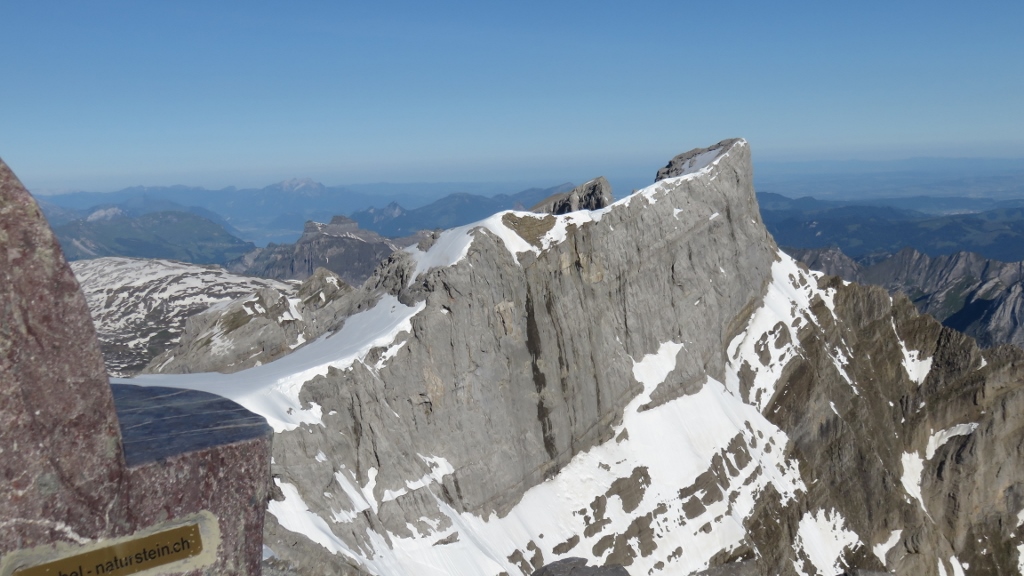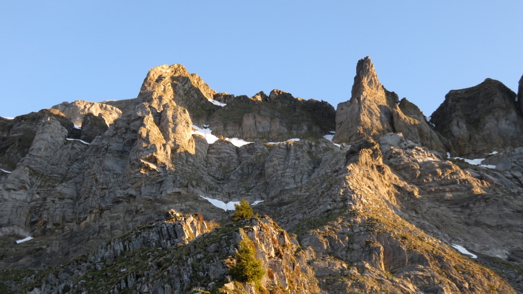 Unter einem herrlichen Sternenhimmel lief ich um 4 Uhr vom Parkplatz der Badi Schwändi P. 682 an der Guppenrus entlang hinauf nach Oberstafel 1658 m. Die Lawinenverbauungen kannte ich noch nicht und der Wanderweg verlief leicht anders wie das letzte Mal, war aber gut markiert. Bei Unter-/Oberstelli hat es noch zwei Schneefelder und der Weg ist teils recht matschig, aber geht alles gut. Kurz darauf lief ich über ein weitere Schneefeld beim Häxenstein, bevor ich mit einen Weg über die Schrofen am Mittelstock vorbei suchte. Über ein weiteres, recht hart gefrorenes Schneefeld erreichte ich den Schrofenhang und stand kurz darauf in der warmen Morgensonne auf dem Grat hinter dem Mittelstock (2h von Schwändi).