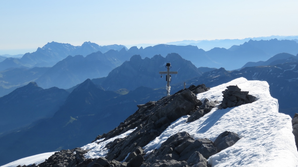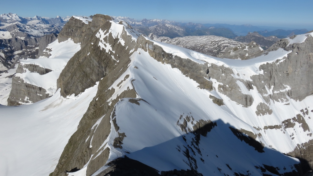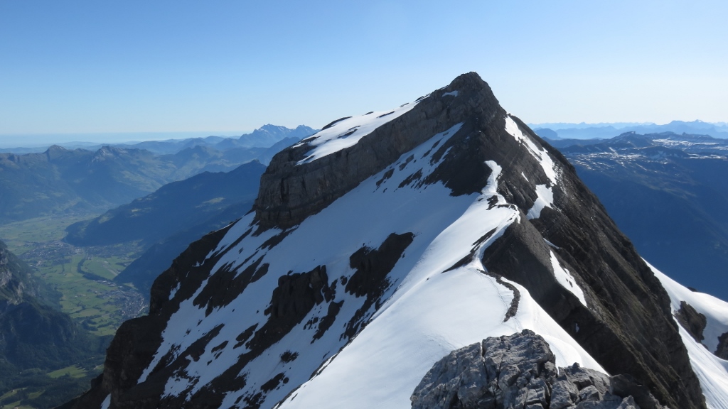 Ohne Probleme errichte ich die Firnrampe und stieg in schon etwas weichem Schnee hinauf aufs Chanzle. Der Schrund ich noch zu und gut zu übersteigen, sollte auch noch ne Weile so bleiben. Dann genoss ich die wunderbare Kletterei auf dem Guppengrat und erreichte nach um 7:45 Uhr den Gipfel des Vrenelisgärtli 2907m.