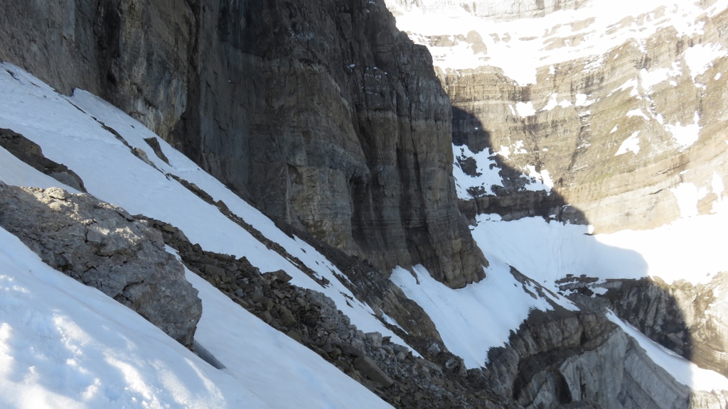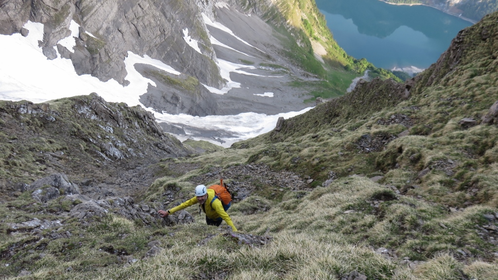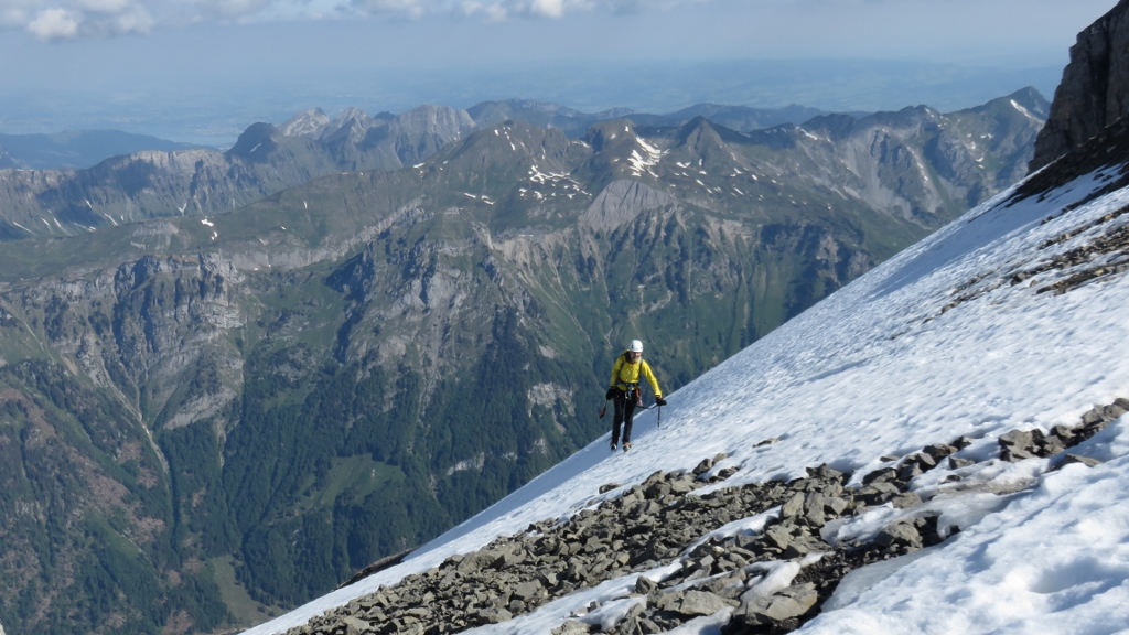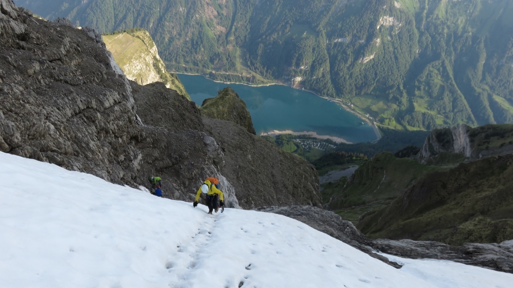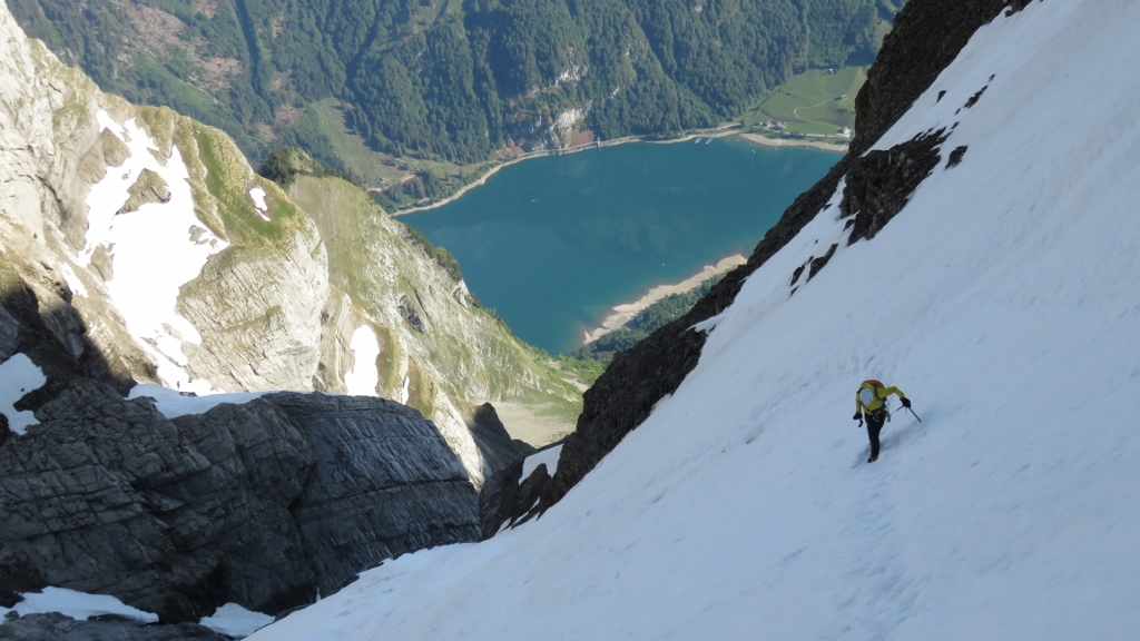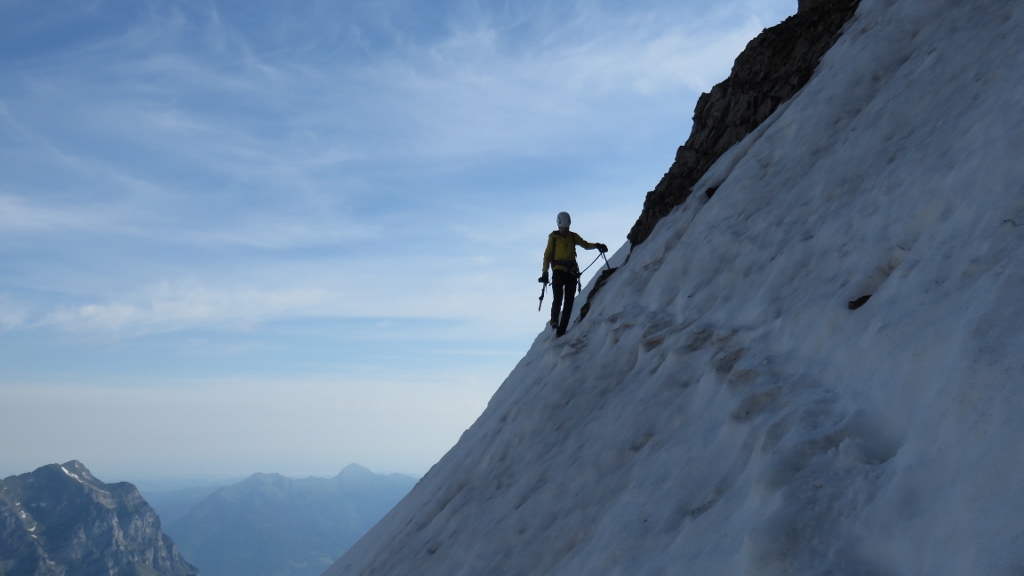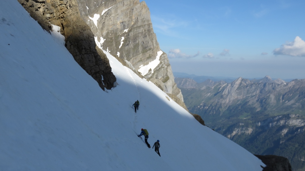 Über gut gestuftes Gras-Schrofengelände stiegen wir weiter steil bergan. Immer wieder trafen wir auf Wegspuren, Steinmännchen und frische Tritte, die uns den Weg wiesen. Nach 3h standen wir endlich auf dem Chnorren 2210m und genossen den herrlichen Morgen. Wenige Meter weiter oben montierten wir die Firnausrüstung und machten uns an die erste Querung nach links. Bis auf zwei apere Stellen war das erste Band noch mit gutem Trittschnee bedeckt. Nachdem wir das schlauchartige erste Couloir erklommen hatten, begann die Querung auf dem zweiten Band nach rechts. Die ersten 100m teils auf Frontzacken im Krebsgang den sehr steilen Firnhang entlang waren recht anregend. Dann wurde die Trittspur breiter, die Neigung des Firns etwas flacher und wir erreichten bald das zweite Couloir in der Mitte des Chalttäli, das wir in guten Trittschnee bis auf den Schwander Grat durchstiegen (5h45min).