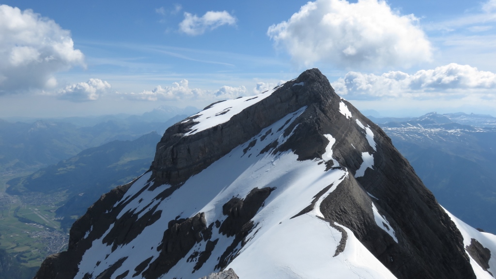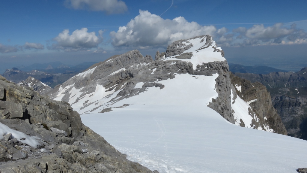 Nach einer gemütlichen Pause ging’s die Ketten hinauf zu P. 2859 und hinüber zum Ruchen 2901m. Von dort konnten wir unseren gesamten Aufstieg aus der Vogelperspektive gewundern. Schon seit einigen Jahren hatte ich diese Route immer wieder aus der Ferne betrachtet und eine Begehung überlegt – endlich hatte alles gepasst: das Wetter war herrlich, die Verhältnisse in der Route konnten nicht besser sein, und mit joerg als Tourenpartner war es ein grossartiges Erlebnis.