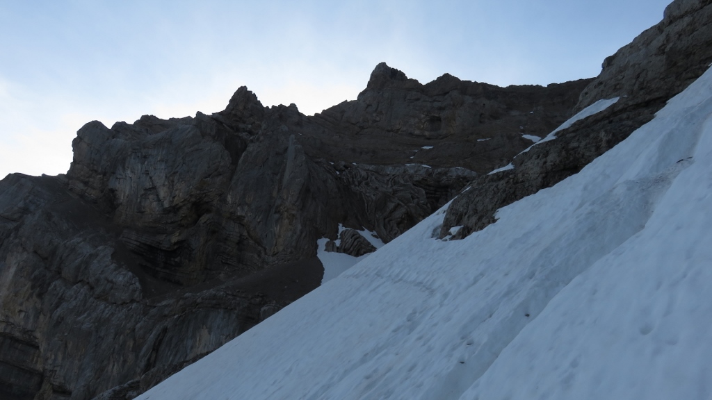 Die Dämmerung zeichnete sich bereits am östlichen Horizont ab, als wir uns von Hintersackberg P.1048 auf den Weg machten. Zunächst stiegen wir zügig an der Tschingelalp vorbei nach Mittelstafel 1449m hinauf. Etwas vor dem Bach folgenden wir kleinen Pfaden in den grossen Kessel hinein. Die Felsstufe in der Mitte überwanden wir durch ein kleines Couloir auf der linken Seite. Dann ging’s weiter stetig bergan auf den Chrummen zu. Leider hatte joerg mittlerweile mit einer heftigen Magenverstimmung zu kämpfen; nach etwas Überlegen beschlossen wir, trotzdem weiter zu gehen, aber das Tempo zu reduzieren. Über ein Schneefeld gelangten wir auf das obere Band, das uns auf den Grashang unterhalb des Chnorren brachte (das untere Band sah für uns nicht so einladend aus, die nachfolgenden Seilschaft ist aber dort hoch).