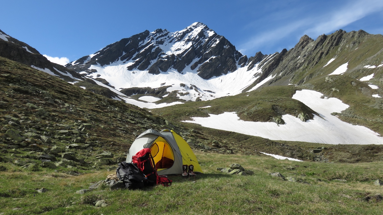 Vom Parkplatz der Linardhütte oberhalb von Lavin 1413m stiegen wir mit schwerem Biwak-Rucksack durch den lichten Wald bergan. Ein kühler Wind und zahlreiche Wolken machten den Aufstieg recht angenehm. Nach etwas über zweieinhalb Stunden hatten wir unseren Biwakplatz oberhalb der Linardhütte auf ca. 2450m erreicht. Der Berg hüllte sich zunächst noch in dichte Wolken, aber gegen 16 Uhr riss die Wolkendecke auf und wir genossen die warmen Sonnenstrahlen. In der Nacht begann es allerdings zu regnen – entgegen der Wetterprognose – und wir waren froh, dass wir uns dafür entschieden hatten, das Zelt mitzunehmen.