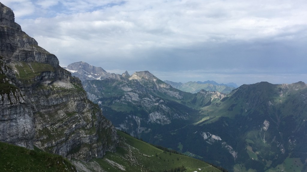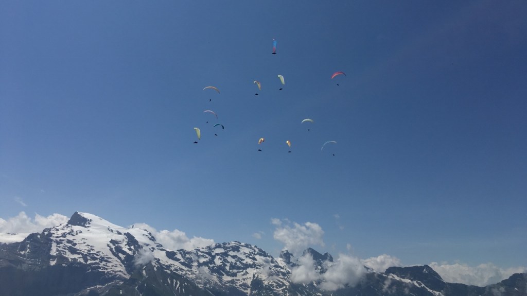 Wir genossen einige Momente das Panorama und das Spiel der aufziehenden Quellwolken, bevor wir hinüber zum Rigidalstock 2593m kraxelten und über den Klettersteig und den Wanderweg zur Brunnihütte 1867m abstiegen. Mehrere Dutzend (ich zählte zwischen 50 und 60!) Gleitschirmflieger schraubten sich oberhalb der Hütte in den Himmel, während wir die warme Sonne auf der Terrasse genossen. Als wir etwas später an der Talstation ankamen, entlud sich der erste Schauer über Engelberg. Merci an Caspar für diese spannende Tour!