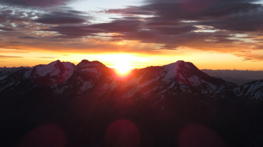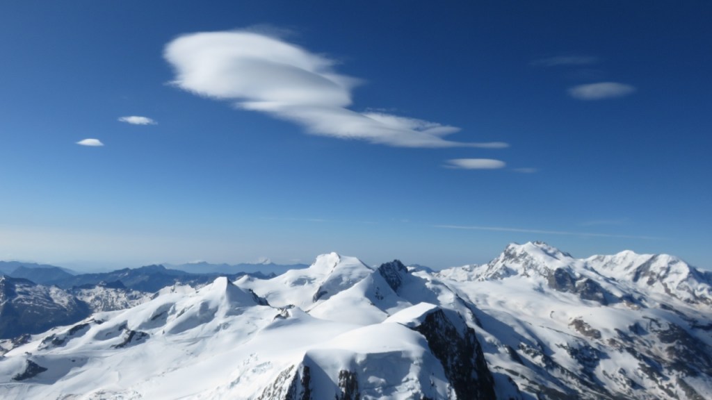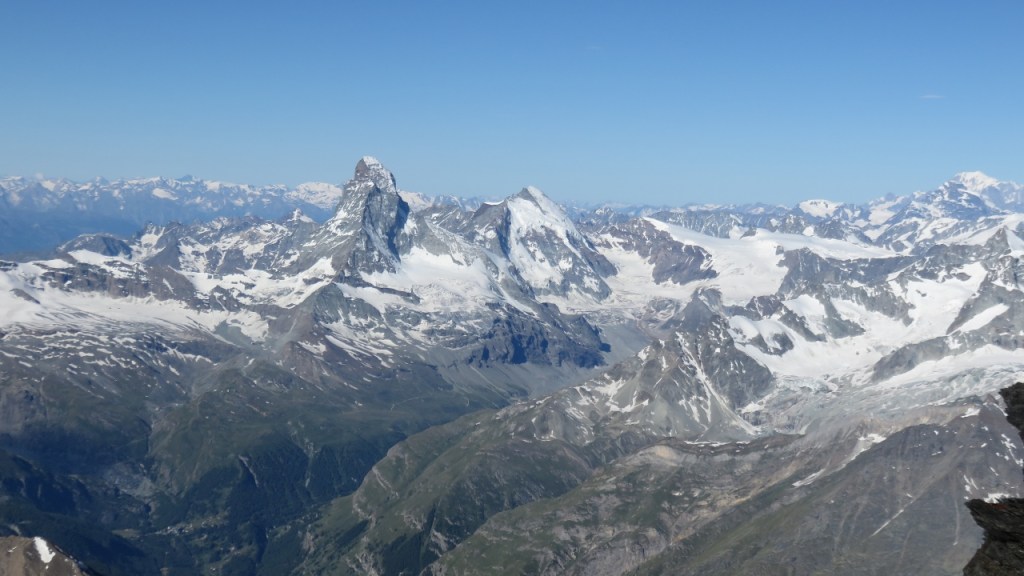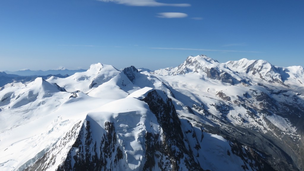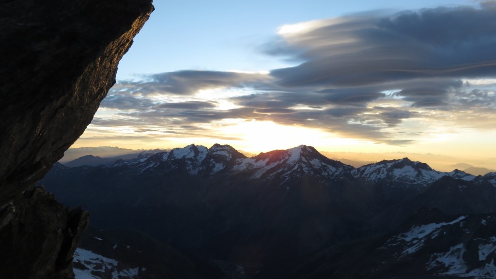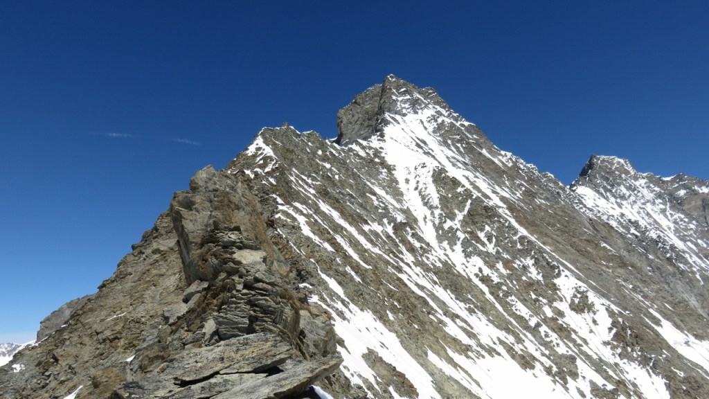 Unterhalb der Gipfelwächte genossen wir in der warmen Sonne den Blick auf die umliegenden Berge. Der Kopf begann allerdings bald zu schmerzen – auf eine Höhenakklimatisierung hatten wir verzichtet – und so machten wir uns an den Abstieg. Die Flanke hinab war etwas mühsam, dann kamen wir über die Schneegrate zügig voran. Allerdings waren die östlich orientieren Flanken bereits recht weich und wir sanken teils bis zum Knie in die weichen und nassen Schnee ein. Das letzten Drittel kraxelten wir dann über die nun schon warmen Fels und erreichten bald darauf das Mischabeljoch. Der kalte Wind hatte den Weingartengletscher noch etwas gekühlt und so konnten wir auf noch fast hartem Schnee selbigen hinab steigen. Nur bei den letzten Spalten war der Schnee bereits weich, was für einige spannende Momente sorgte. Ohne Zwischenfälle erreichten wir unser Biwak (4h vom Gipfel).