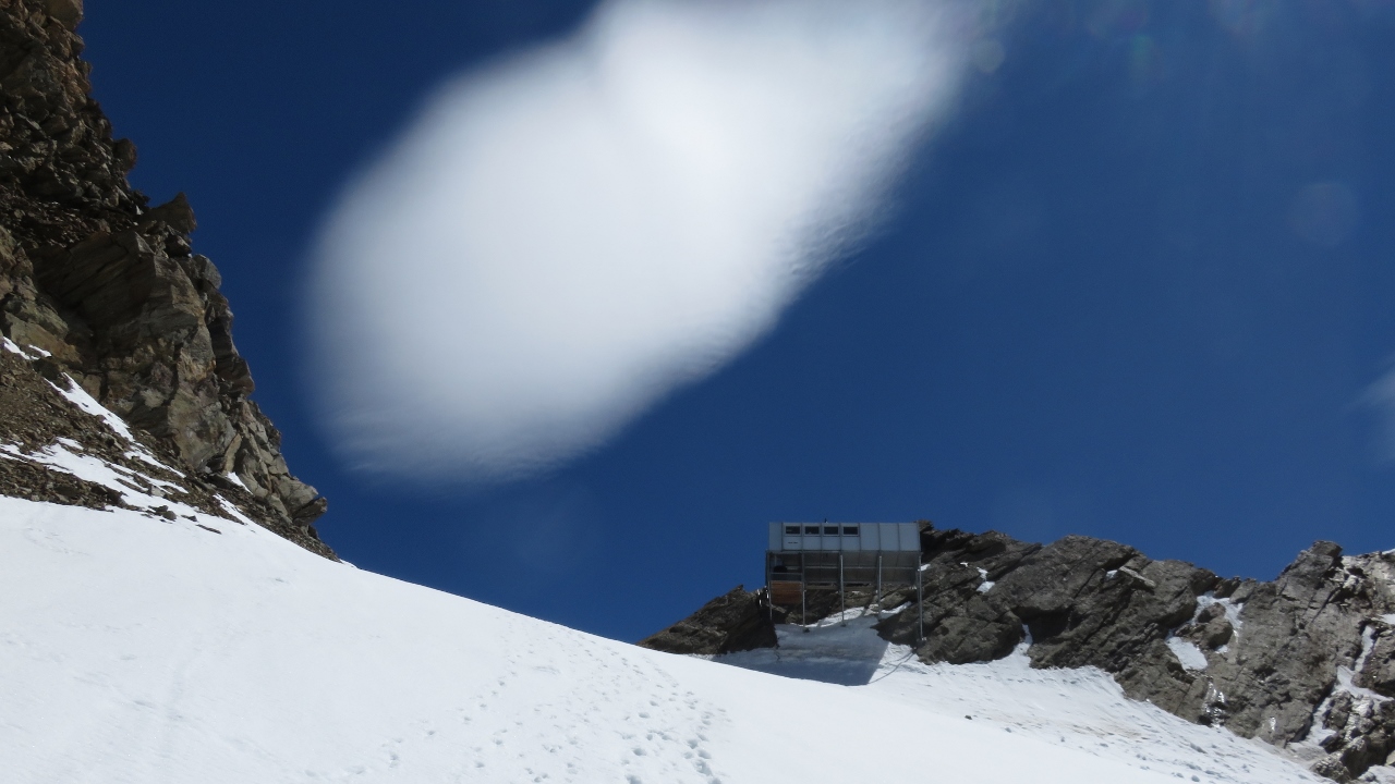 Unterhalb der Gipfelwächte genossen wir in der warmen Sonne den Blick auf die umliegenden Berge. Der Kopf begann allerdings bald zu schmerzen – auf eine Höhenakklimatisierung hatten wir verzichtet – und so machten wir uns an den Abstieg. Die Flanke hinab war etwas mühsam, dann kamen wir über die Schneegrate zügig voran. Allerdings waren die östlich orientieren Flanken bereits recht weich und wir sanken teils bis zum Knie in die weichen und nassen Schnee ein. Das letzten Drittel kraxelten wir dann über die nun schon warmen Fels und erreichten bald darauf das Mischabeljoch. Der kalte Wind hatte den Weingartengletscher noch etwas gekühlt und so konnten wir auf noch fast hartem Schnee selbigen hinab steigen. Nur bei den letzten Spalten war der Schnee bereits weich, was für einige spannende Momente sorgte. Ohne Zwischenfälle erreichten wir unser Biwak (4h vom Gipfel).