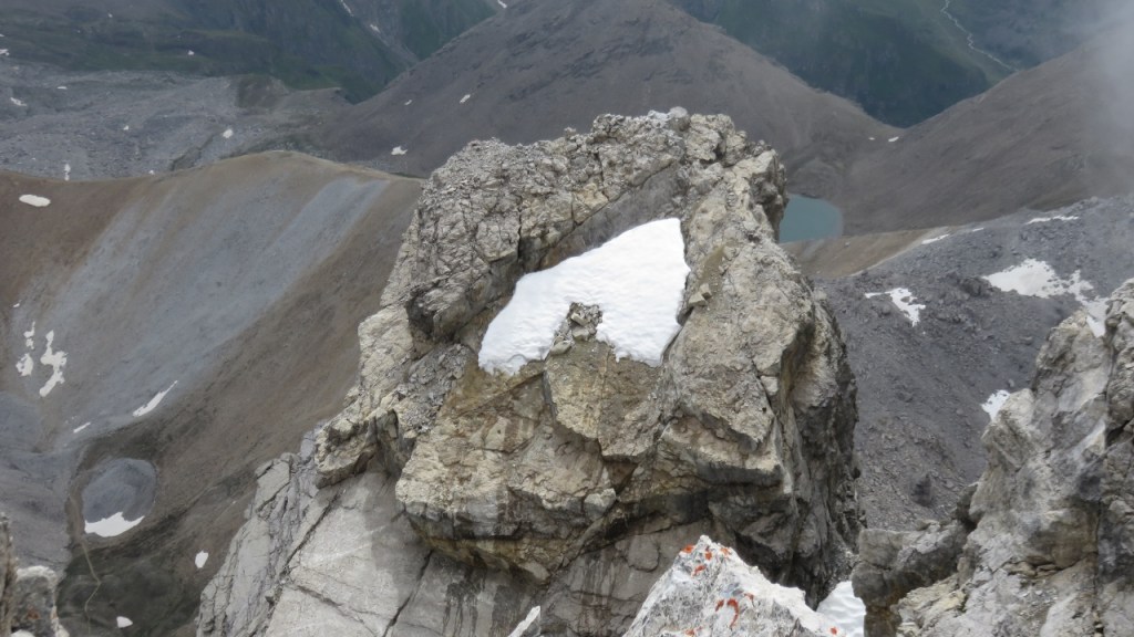 Durch das, vor allem im oberen Bereich ziemlich brüchige Couloir rechts des grossen Turms P.2748 erreichten wir den Gratrücken zwischen Corn da Tinizong und Piz Mitgel. Nun folgten wir den roten Punkten, die fröhlich die Route markierten. Bald passierten wir P.2862, wo die eigentlich Kletterei (bis 4c) begann. Zahlreiche, recht neue Stände und Haken und natürlich die fröhlichen roten Punkte wiesen uns den Weg durch die spannenden und abwechslungsreichen Rinnen, Kamine, Bänder und Gratabschnitte. Leider hüllten dichte Quellwolken die Berge ein, als wir den Gipfel des Corn da Tinizong 3173m erreichten (3h von P.2454).