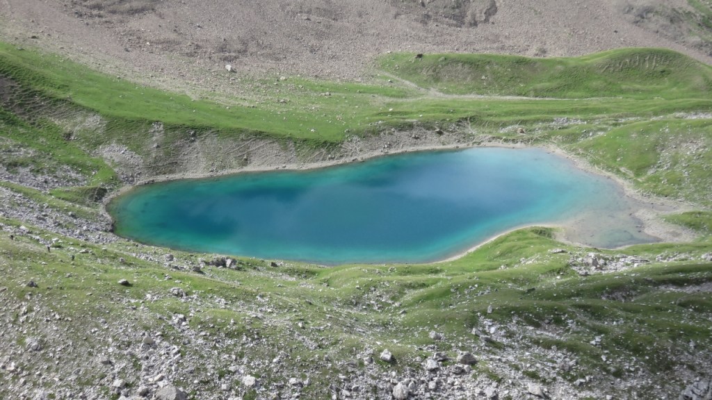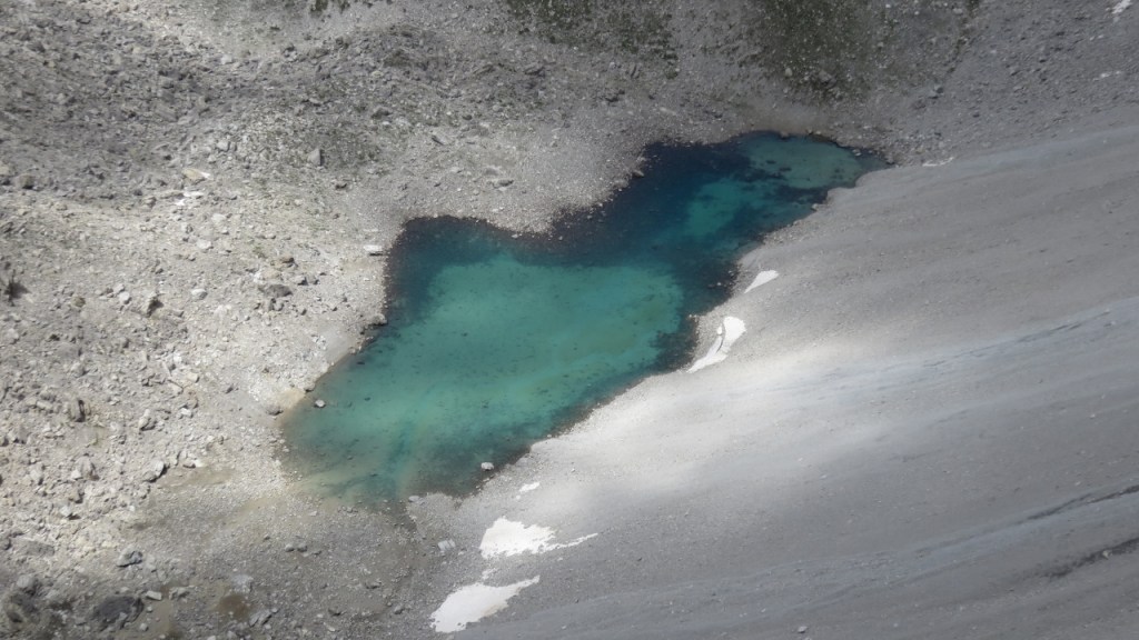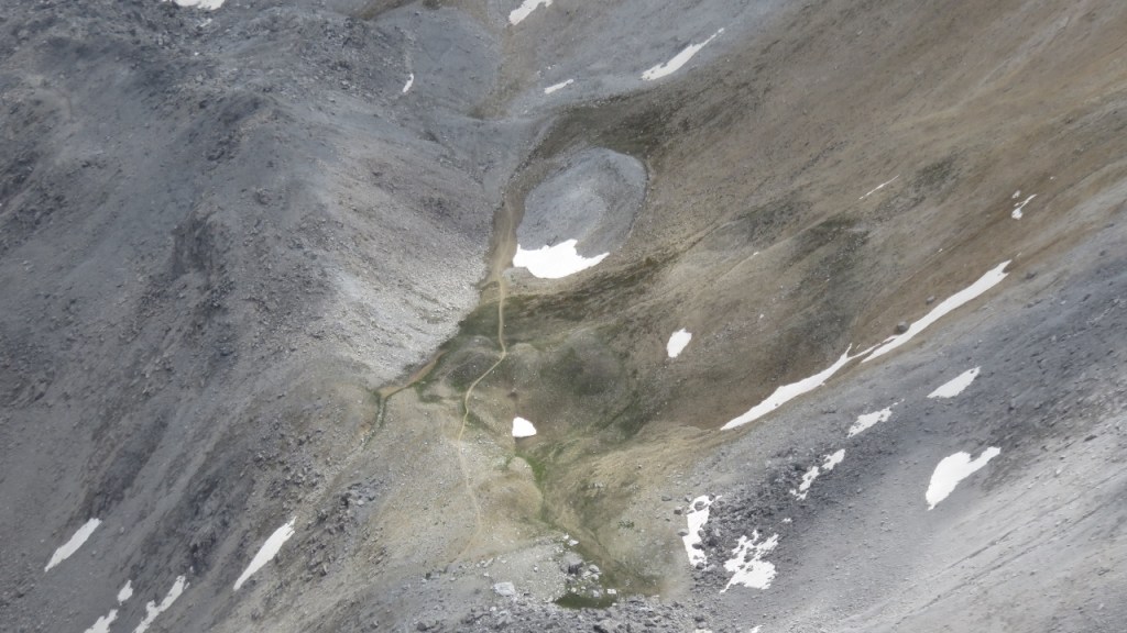 Für den Abstieg wählten wir die mit nicht weniger fröhlichen grünen Punkten und Strichen markierten Weg (max. 3a), der allerdings durch brüchigeres Gelände und viel loses Zeugs führt. Wir kamen trotzdem gut voran und erreicht nach knapp drei Stunden unser Materialdepot.e