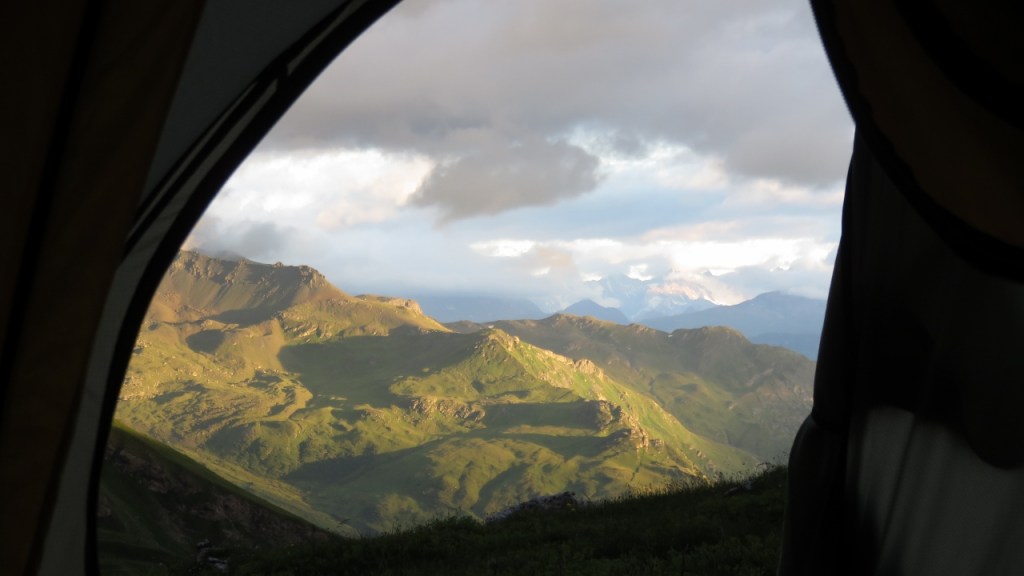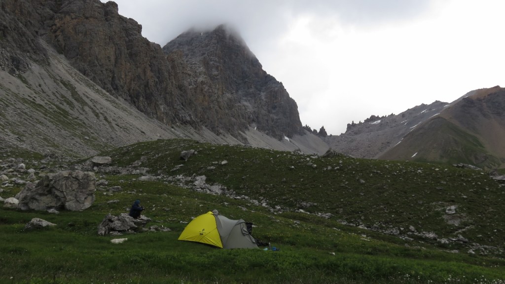 Etwas westlich von P.2454 (und selbstverständlich ausserhalb des Jagdbanngebietes!) schlugen wir uns Zelt auf und genossen den Abend in der stillen Bergwelt. Allerdings musste ich zu meinem Verdruss verstellen, das meine Luftmatratze ein Loch hatte (wohl von den scharfkantigen Bröseln am Weingartensee) und ich daher keine allzu angenehme Nacht verbringen musste…