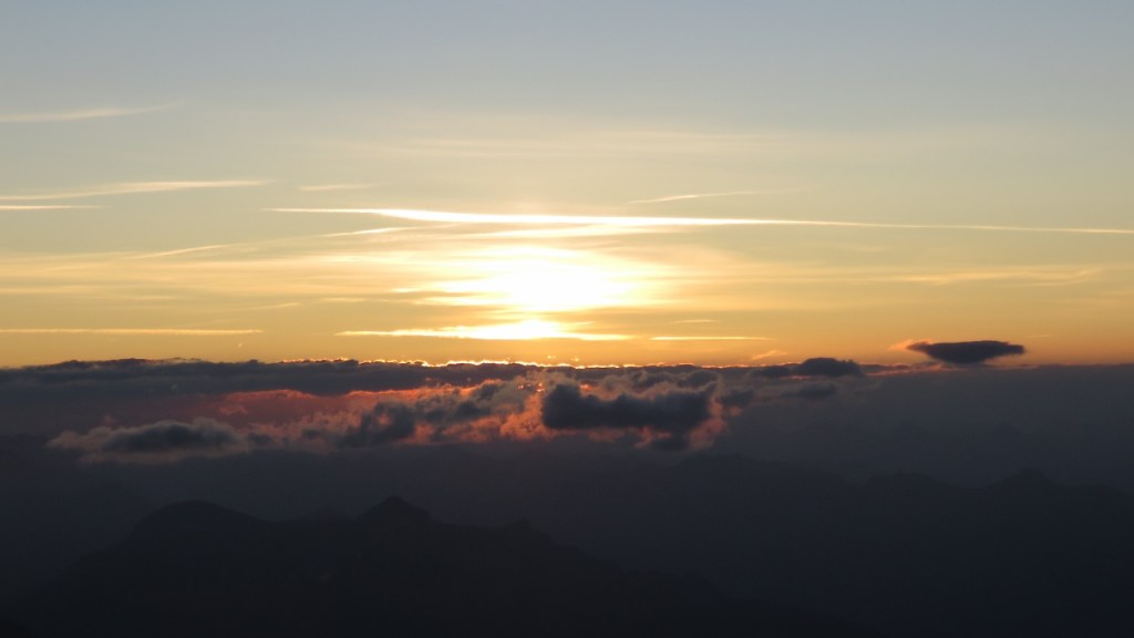 Wegen des zweifelhaften Wetters mussten wir die ganz grossen Pläne für diese Woche aufgeben und entschieden uns für eine Plaisir-Variante. Am Nachmittag des Vortags waren wir mit der Bahn zum Hohsaas-Bergrestaurant gefahren und hatten die Aussicht auf das heraufziehende Gewitter genossen. Die Mischabelgruppe hielt wohl einen Grossteil der Störung ab, bei uns kam daher nicht viel Niederschlag an – gute Voraussetzungen für den morgigen Tag.