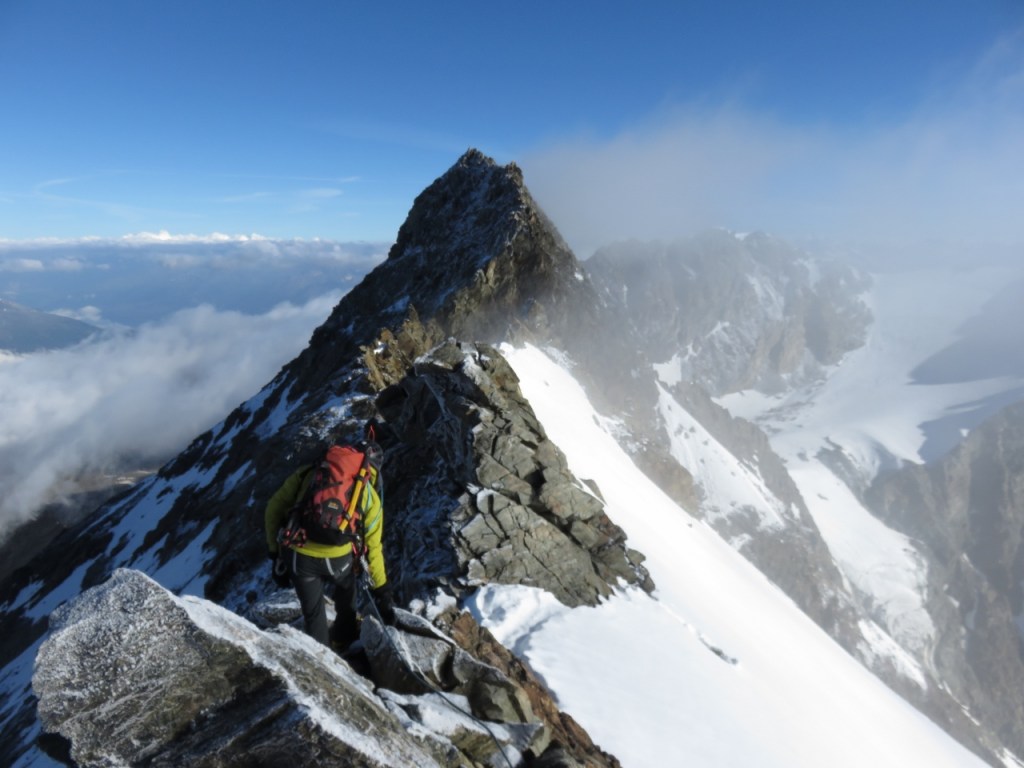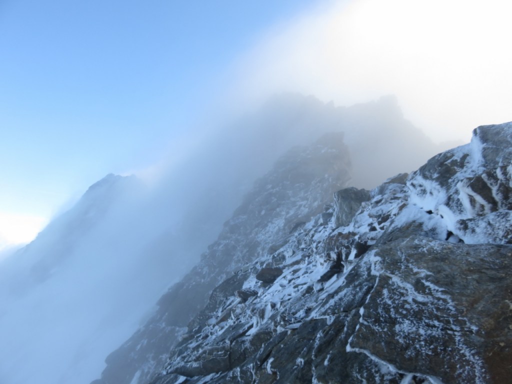 Die Nacht war sternenklar als wir uns um 4:25 Uhr auf den Weg machten. Nach kurzweiligem Marsch standen wir um 5:30 Uhr im Lagginjoch 3498m und kraxelten anschliessend mit den ersten Sonnenstrahlen den unteren Gratabschnitt hinauf. Nur der eiskalte Wind störte die Idylle etwas. Bald hatten wir den ersten Aufschwung erreicht und montierten das Seil. In anregender und abwechslungsreicher Kraxelei und Kletterei düsten wir hinauf bis zum ersten Gendarmen. Hier änderte sich der Charakter der Tour: auf der Westseite lag eine dünne Neuschnee-Schicht der vergangenen Nacht, zusammen mit dem starken Wind und den Wolkenfetzen kamen Erinnerungen an den Winter auf. Nachdem wir die Abseilstelle überwunden hatten, wechselten wir auf Steigeisen und setzen unseren Weg, leicht gebremst durch die Verhältnisse, fort. Nach etwas über vier Stunden Kletterei hatten wir den Gipfel des Lagginhorns 4010m erreicht.