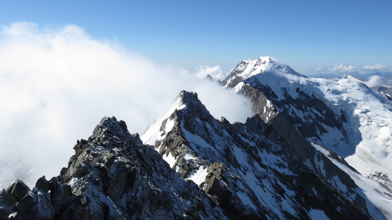Die Nacht war sternenklar als wir uns um 4:25 Uhr auf den Weg machten. Nach kurzweiligem Marsch standen wir um 5:30 Uhr im Lagginjoch 3498m und kraxelten anschliessend mit den ersten Sonnenstrahlen den unteren Gratabschnitt hinauf. Nur der eiskalte Wind störte die Idylle etwas. Bald hatten wir den ersten Aufschwung erreicht und montierten das Seil. In anregender und abwechslungsreicher Kraxelei und Kletterei düsten wir hinauf bis zum ersten Gendarmen. Hier änderte sich der Charakter der Tour: auf der Westseite lag eine dünne Neuschnee-Schicht der vergangenen Nacht, zusammen mit dem starken Wind und den Wolkenfetzen kamen Erinnerungen an den Winter auf. Nachdem wir die Abseilstelle überwunden hatten, wechselten wir auf Steigeisen und setzen unseren Weg, leicht gebremst durch die Verhältnisse, fort. Nach etwas über vier Stunden Kletterei hatten wir den Gipfel des Lagginhorns 4010m erreicht.