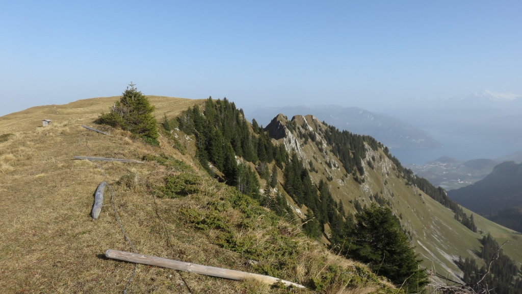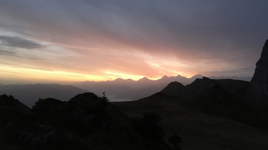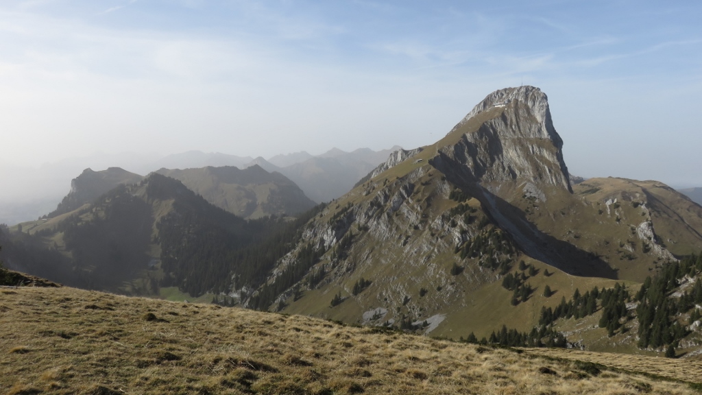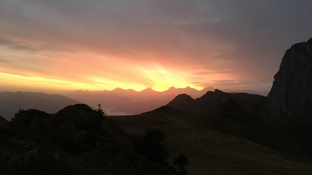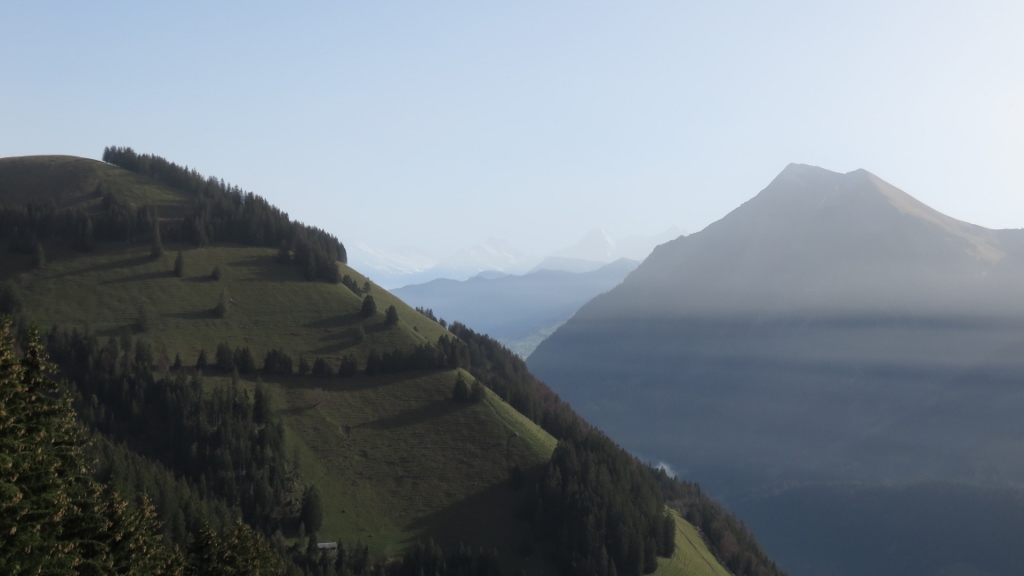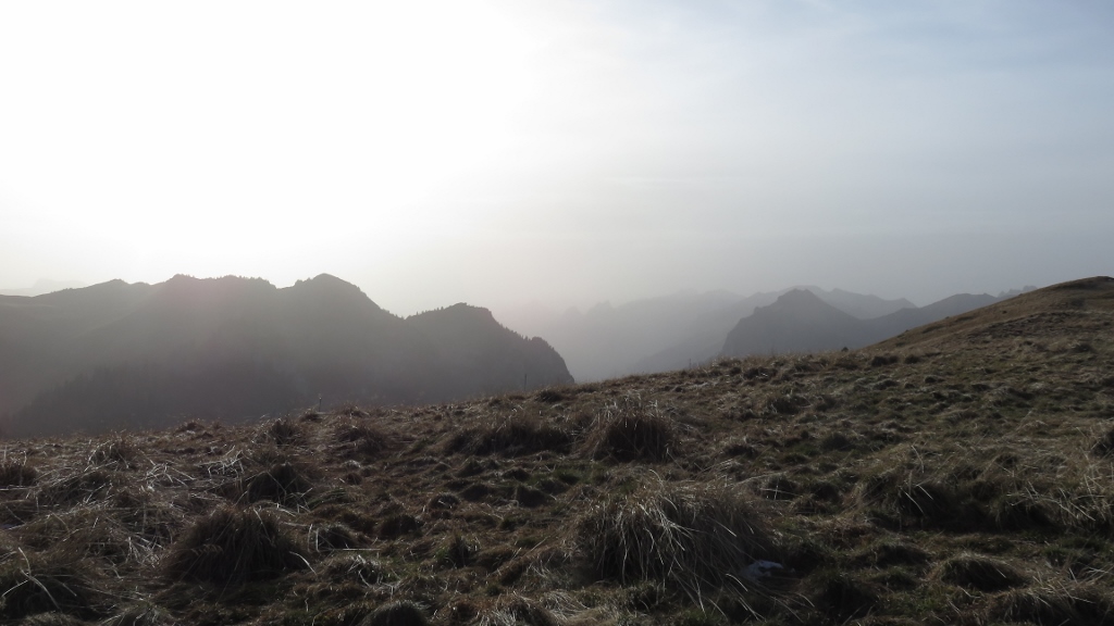 Wegen eines Zugausfalls kam ich erste eine halbe Stunde später als geplant am Bahnhof in Erlenbach im Simmental 680m an und begann meinen Aufstieg mit schwerem Biwakrucksack. An Thal 873m, Müllerbode 1371m und Spittelnacki 1434m vorbei erreichte ich schliesslich Steinigs Nacki 1605m, wo ich meinen Wasservorrat auffüllte. Mit dann drei Kilogramm mehr auf dem Rücken stieg ich über das Furgge hinauf zum Laseberg 2019m, auf dem ich eine verspätete Mittagsrast einlegte. Nach kurzem Abstieg zu P.1851 stieg ich am viel bevölkertem Stockhorn vorbei zu P.2042 und hinab zum Baachegg 1803m. An der Oberi Walalp füllte ich meinen Wasservorrat nach, bevor ich hinauf zum Walalpgrat stieg, auf dem ich die grossartige Bergkulisse und die herbstliche Abendstimmung genoss.