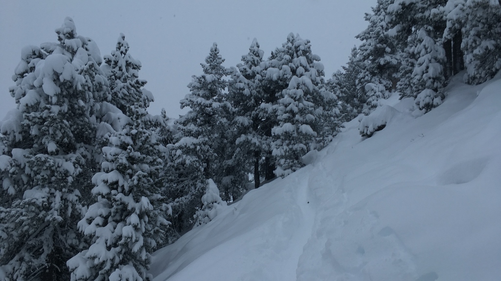 Die gestrige Tour auf’s Laucherenstöckli hatte Lust auf mehr gemacht. Allerdings war das Wetter nicht besonders gut und es schneite unaufhörlich. Trotzdem entschloss ich mich, nochmals raus zu gehen. Von Oberiberg folgte ich der frisch angelegten Spur bergan und war wegen des tiefen Schnees (teils bis 40cm) recht froh, dass ich diese Arbeit heute nicht verrichten musste. Am Gipfel hatte ich die vier Spurarbeiter schliesslich eingeholt. Die Sicht für die erste Abfahrt war nicht gut, aber wegen des tiefen Schnees musste man eigentlich eh nur geradeaus fahren. Bei Gütsch P.1137 klebte ich die Felle wieder an und marschierte ein zweites Mal bergan, nun zum Grat nördlich des Farenstöcklis. Die zweite Abfahrt war nicht wenig sensationell, teils flog der Schnee bis zum Hals.