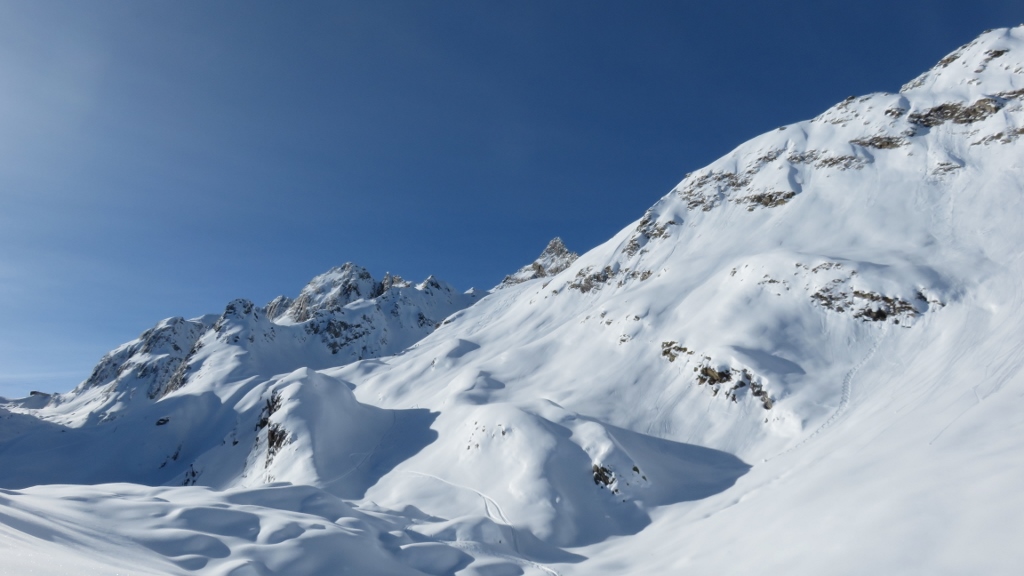 Wir fuhren auf der sicheren Südseite durch feinsten Pulverschnee hinab ins Val Torta und fellten oberhalb dem Zusammenfluss der drei Bäche auf ca. 2200m wieder an. Kurz darauf hatten wir den Passo di Naret erreicht und genossen ein letztes Mal die warme Frühlingssonne im Dezember. Vom Pass genossen wir eine dritte herrliche Abfahrt durch wunderbaren Schnee, bevor wir ein viertes Mal die Felle für den kurzen Gegenanstieg zu P.2149 hinauf anklebt. Anschliessend zogen wir unsere Linien hinab durch das tief verschneite Tal zum Auto zurück. Auch wenn der ursprüngliche Plan nicht aufgegangen war, so hatten wir doch einen herrlichen Tag im Val Torta bei wunderbaren Schneebedingungen genossen.