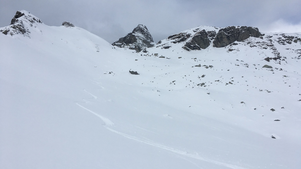 Die heutige Geschichte ist schnell erzählt: Loslaufen in der Morgendämmerung, weicher Schnee im Wald, harter Schnee bei der Skihütte Ober Erbs, fast kein Schnee in der Flanke (und der, der noch lag war teils sehr knusprig), viele neu Steine und Felsen kennengelernt beim Rotstock. Oberhalb des Rotstocks vor der Querung unter P.2610 hindurch hatte ich dann keine Lust mehr auf weitere Steine und zog die Felle von den Skiern. Ausserdem hatte sich die Sicht deutlich verschlechtert und ich hatte keine Lust auf White-Out bei diesen Bedingungen. Einige zugewehte Spuren führten mich zum Erbser Chärpf hinab, wo ich tatsächlich noch einige schöne Hänge fand, bevor ich gegen den Bruchharsch ankämpfen und den versteckten Steinen ausweichen musste. Im Tälchen des Baches nördlich der Hanegg fuhr ich schliesslich hinab, bis ich nach Tritt 1798m hinausqueren und auf dem Wegelein hinab zur Skihütte fahren konnte. Etwas enttäuscht über die meine ungeschickte Wahl, aber doch noch glücklich über die ausgetüftelte Abfahrtsvariante stieg ich wieder ins Alpinomobil und trat die Heimreise an.