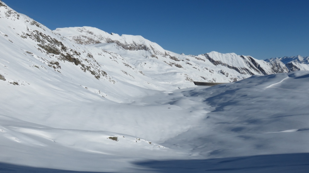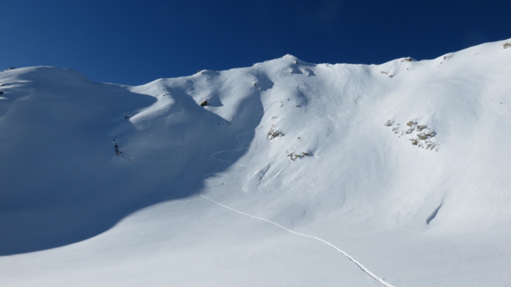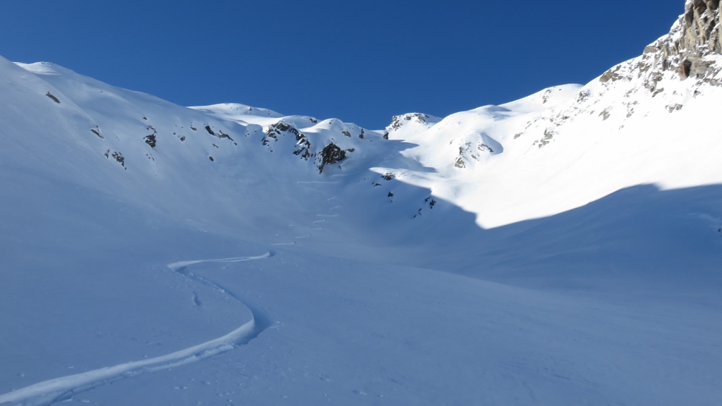 Endlich in der wärmenden Sonne und ohne den lästigen kalten Wind genoss ich knapp unterhalb des Gipfels die Ruhe der Bergwelt und den herrlichen Ausblick auf die umliegenden Gipfel. Vom Gipfel fuhr ich dann durch die Südostflanke ab – erst herrlicher Powder, dann überraschte mich in einer Kehre der Winddeckel, was zu einem unschönen Knick mit Delle in meiner Spur führte :). Nach weiterem Winddeckel in der Ebene genoss ich die pulvrige Abfahrt durch das Couloir und zog tatsächlich „First Lines“ hinab zum Lago del Corbo. Nach kurzem Gegenanstieg zum Passo del Narèt gab‘s eine weitere Pulverabfahrt zurück ins Val Torta. Für den kurzen Anstieg zu P.2149 klebte ich die Felle wieder an, bevor ich genüsslich durch das Tal zum Ausgangspunkt hinabfuhr. Der Ausflug hat sich gelohnt!