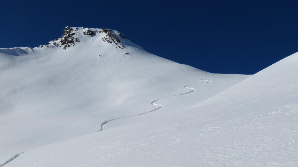 Endlich in der wärmenden Sonne und ohne den lästigen kalten Wind genoss ich knapp unterhalb des Gipfels die Ruhe der Bergwelt und den herrlichen Ausblick auf die umliegenden Gipfel. Vom Gipfel fuhr ich dann durch die Südostflanke ab – erst herrlicher Powder, dann überraschte mich in einer Kehre der Winddeckel, was zu einem unschönen Knick mit Delle in meiner Spur führte :). Nach weiterem Winddeckel in der Ebene genoss ich die pulvrige Abfahrt durch das Couloir und zog tatsächlich „First Lines“ hinab zum Lago del Corbo. Nach kurzem Gegenanstieg zum Passo del Narèt gab‘s eine weitere Pulverabfahrt zurück ins Val Torta. Für den kurzen Anstieg zu P.2149 klebte ich die Felle wieder an, bevor ich genüsslich durch das Tal zum Ausgangspunkt hinabfuhr. Der Ausflug hat sich gelohnt!