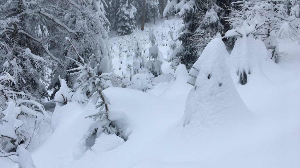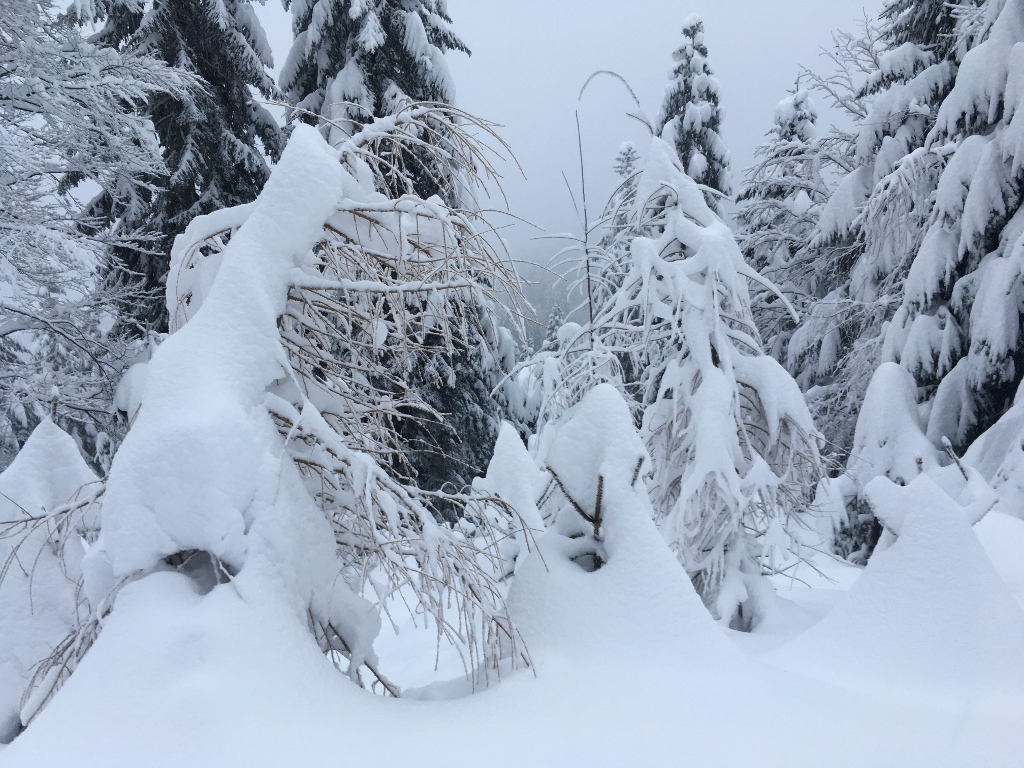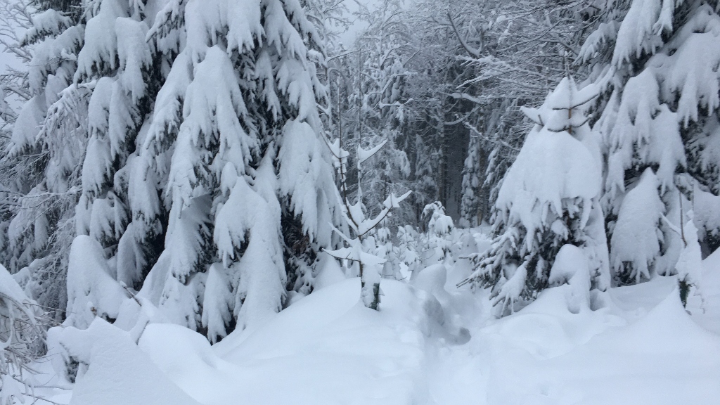 Es ist ja auch mal toll, beim dichtem Schneefall durch den Wald zu laufen… macht man ja eigentlich viel zu wenig. Vor allem, weil es nie so viel und anhaltend schneit in diesen Zeiten. Aber Frau Holle hat es ganz besonders gut gemeint und nach der grossen Ladung Schnee am Donnerstag und Freitag gleich nochmals einen weiteren Tag mit heftigen Schneefall eingerichtet. Von Parkplatz beim Skilift in Boden 765m bei Unterägeri wanderten wir gut gelaunt durch den tief verschneiten Wald. Zahlreiche Schneeschuhgänger hatten bereits einen breiten Weg getreten, so dass wir auch ohne diese herrlichen Sportgeräte gut voran kamen. Am Hafenbach entland stiegen wir aufs Räbrüti und P.1018. Wir genossen die wunderbare Winterstimmung und freuten uns an den vielfältigen Eindrücken des Winterwaldes. An der Abbruchkante entlang ging’s bei kalten Seitenwind nach Norden zu P.1001. Durch Tubenloch (toller Name für einen engen Tobel!) und P.943 stiegen wir wieder hinab nach Vorder Chuewart und zurück zum Ausgangspunkt.