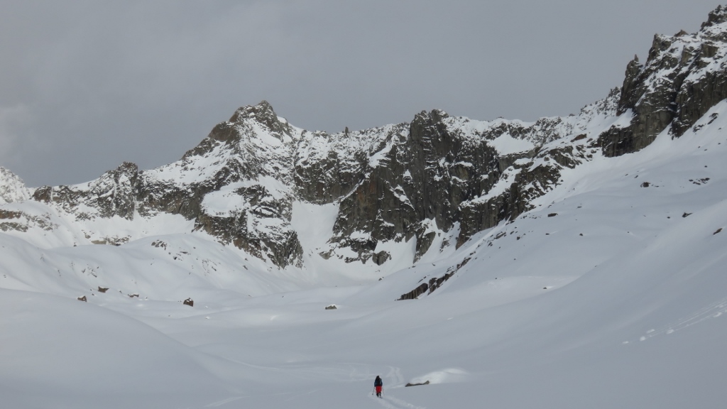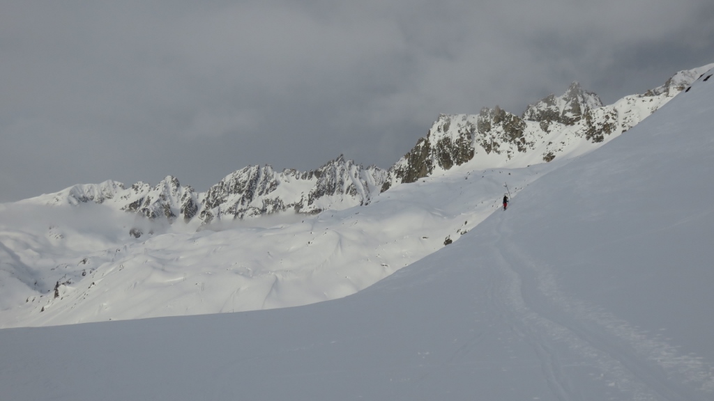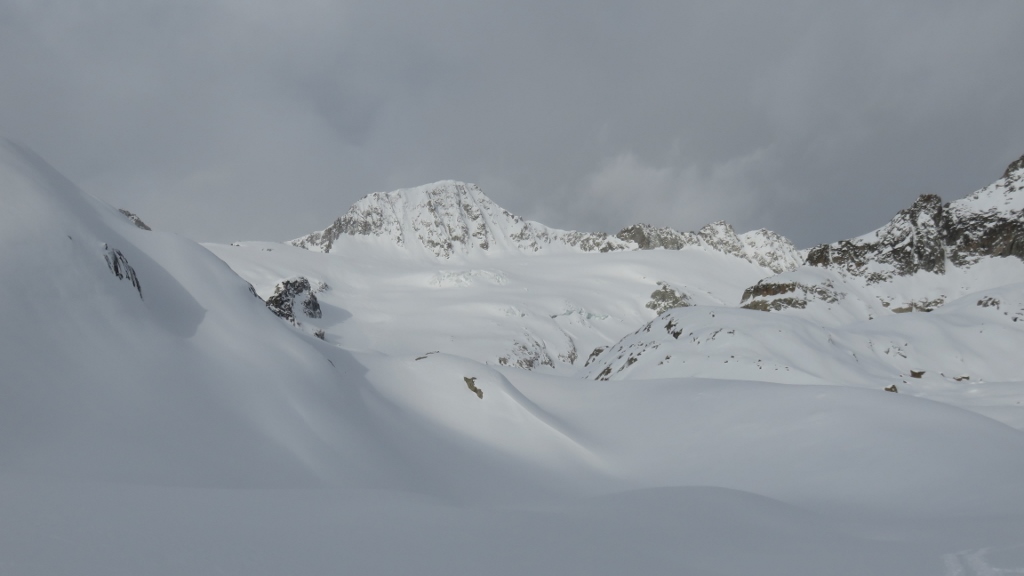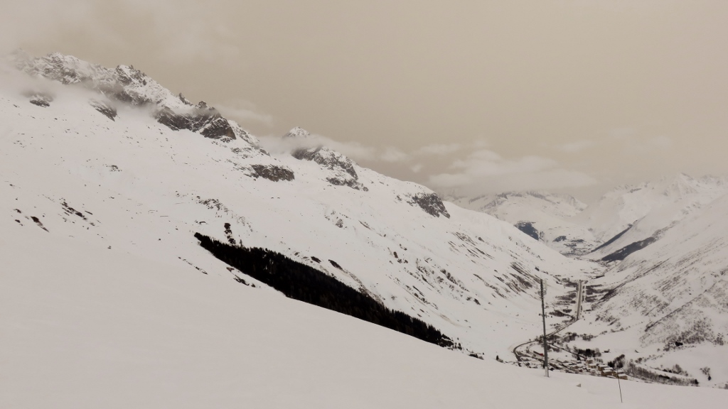 Es herrschte schon reger Betrieb auf dem Weg zum Hotel Galenstock, als ich um 7:15 Uhr von Realp in den etwas bewölkten Morgen startete. Die lockeren Wolken verzogen sich allerdings bald auf dem Weg zur Albert-Heim-Hütte und die Sonne schien durch die milchigen Wolken. Beim Aufstieg entlang des Strahlengrätlis zog die angekündigte Saharastaubwolke ins über das Gebiet, färbte den Himmel gelblich-orange und liess eine Reihe von Wolken aufsteigen. Als ich nach 3h15min in der Oberen Bielenlücke 3220m ankam, war der Himmel bereits recht verhangen und ich beeilte mich, durch den gepressten Schnee genussreiche Schleifen hinab zu ziehen. Tatsächlich verschwand der ganze Gletscherhang kurz darauf in dichter Bbewölkung. Nach kurzem Gegenanstieg fuhr ich hinunter nach Älpetli und fand zuerst noch etwas pulvrigen Schnee, bevor ich mich durch den zerfahrenen und reichlich anstrengenden Bruchharsch zur Passstrasse hinunter kämpfte. Nach einer flotten Passage auf der Passstrasse düste ich durch den fast schon firnigen Schnee hinab zum Ausgangspunkt.