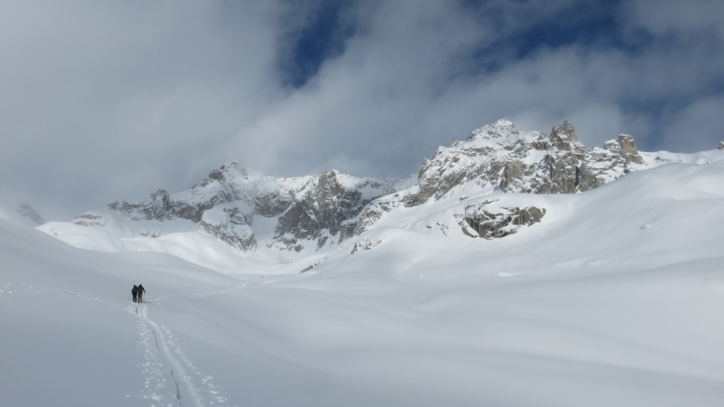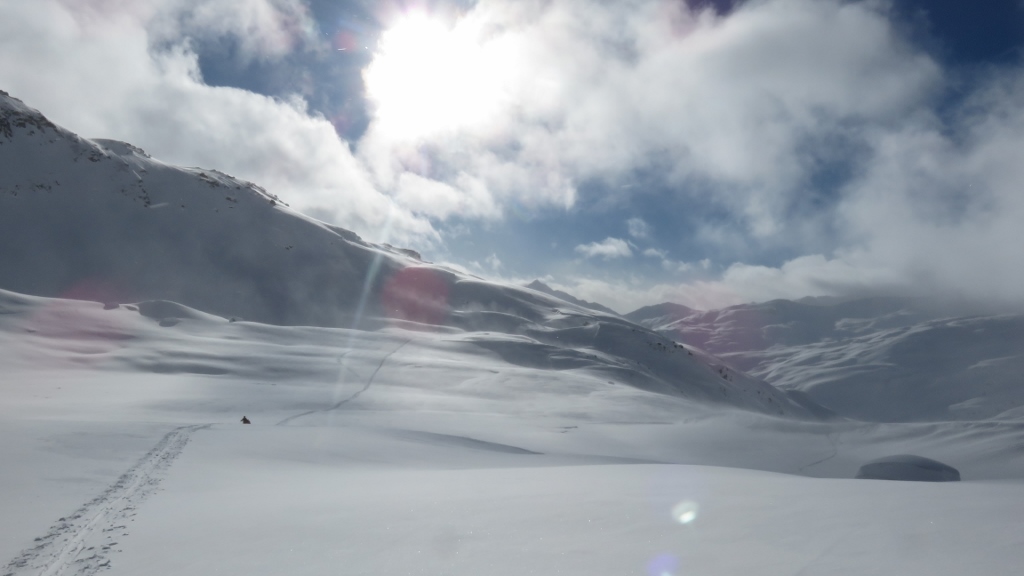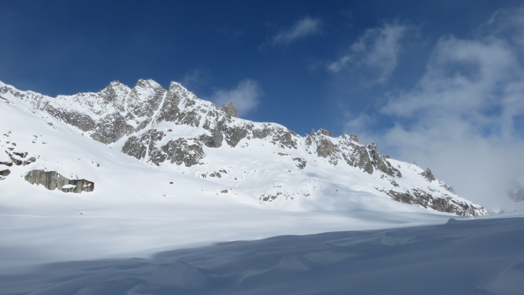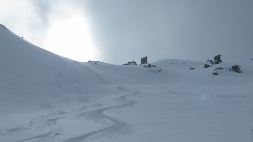 Da die Kaltfront der zweiten Nachthälfte erst am späten Vormittag abziehen und ein wenig Sonne Platz machen sollte – so zumindest versprach das Wetterorakel – startete ich erst um 8:15 Uhr von Realp in den noch ziemlich wolkenverhangenen Tag. Bei leichtem, graupeligem Schneefall stieg ich hinauf zum Hotel Galenstock, wo dann die Sonne hervorkam – allerdings bald begleitet von einem starken und kalten Westwind, der vor der Furkapasshöhe herüber fegte. Erst als ich an der Albert-Heim-Hütte vorbei lief, legte sich der Wind etwas. Allerdings drückten nun erneut dicke Wolken ins Gebiet und v.a. der Galenstock und die umliegenden Gipfel hüllten sich in dichte Bewölkung. Ich folgte trotzdem der frisch angelegten Spur den Gletscher hinauf in Richtung Obere Bielenlücke. Die 4er-Gruppe, die die Spur angelegt hatte, kam mir aber bald entgegen gefahren. Weil sich die Kaltfront also offensichtlich am Abziehen nach Osten Zeit liess, trödelte ich auch etwas herum und stieg gemütlich den Hang hinauf. Bald erreichte ich den Endpunkt der Spur auf ca. 2950 m – gerade dort, wo die dichten Wolken begannen. Ich hatte keine grosse Lust, im Nebel herum zu irren und machte eine ausgiebige Pause. Als jedoch auch ein weiterer Tourengeher kein besseres Wetter mitbrachte, entschloss ich mich zur Umkehr und fuhr hinab an die Gletscherzunge auf 2500 m. Von dort stieg ich hinauf zum höchsten Punkt des Chli Bielenhorns 2941m, das man heute tatsächlich bis zum Gipfel mit Skiern begehen konnte. Mit einer weiteren Tourengeherin rekognoszierte ich zunächst die steile Nordabfahrt (nicht gut, zu viel Triebschnee), bevor wir entlang der Aufstiegsspur und dann via Chräijennest P.2540 zum Hotel Tiefenbach abfuhren. Je nach Exposition war der Schnee wunderbar pulvrig oder leicht windgedeckelt. Über die Passstrasse fuhr ich wieder hinab nach Realp. Trotz – oder gerade wegen – der vielen Wolken eine interessante und genussreiche Tour.