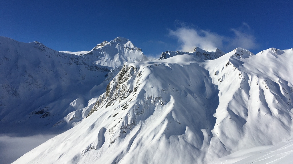 Ein weiterer Tourengänger erreichte die Scharte etwas nach mir – danke für das Retten meiner Mütze! – und zusammen kurvten wir genussreich durch herrlichsten Pulverschnee nach Osten hinab. Eigentlich wollte ich von hier ins Tal abfahren, aber ich liess mich zu einem erneuten Aufstieg überreden. So liefen wir zusammen hinüber zur Aufstiegsroute und stiegen bis unterhalb P.2611 auf. Von hier fuhren wir durch die Bischofsalp hinab ins Tal. Der Talkessel war von zahllosen Spuren bereits fast völlig umgegraben – so viele Leute hatte ich hier noch nie gesehen. Ein Geheimtipp, wie vor vl fünf oder sechs Jahre noch, ist diese Abfahrtsroute offenbar nicht mehr…