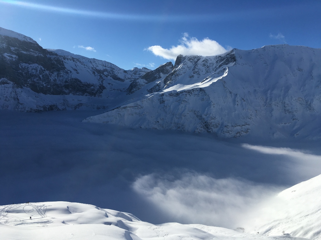 Oberhalb des Rotstock hatten eben zwei Tourengeher damit begonnen, eine Spur hinüber Richtung Gross Chärpf zu legen. Dankend schloss ich mich ihnen an und revanchierte mich anschliessend, indem ich die Spur von Skidepot zum Gipfel durch den tiefen Schnee wühlte (3h).