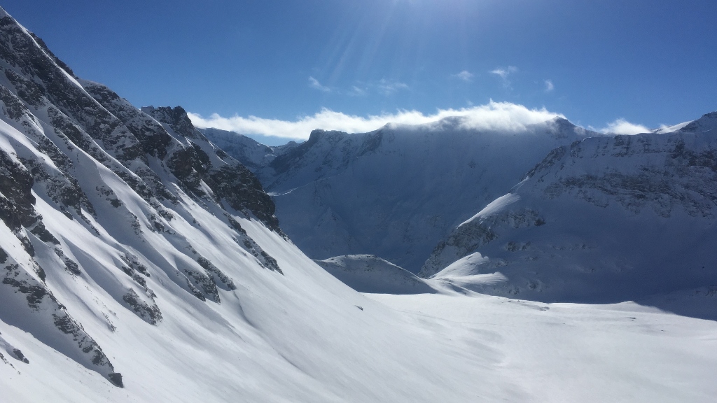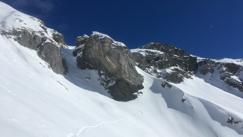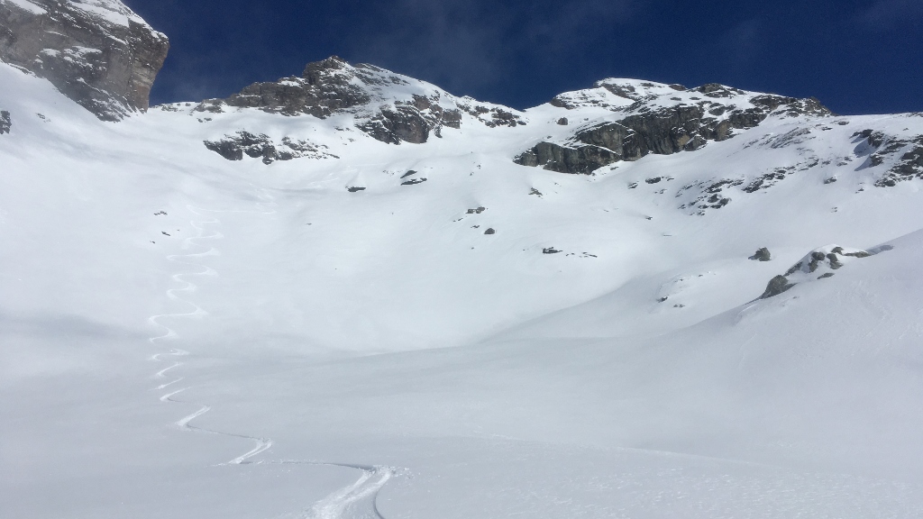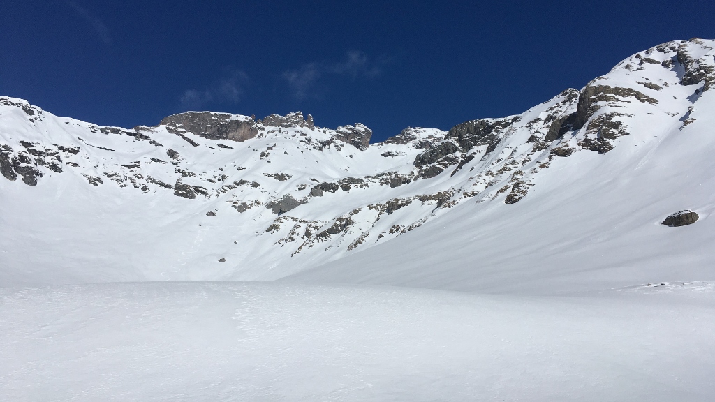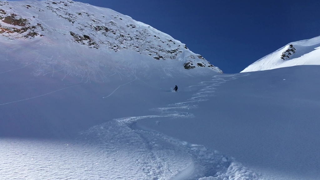 Nachdem ich die Sonne genossen hatte, zog ich meine Kurven durch den leicht krustigen Schnee die Südhänge hinunter und passierte problemlos das enge Couloir bei P.2360. Die weiteren Hänge waren ähnlich krustig, aber noch gut zu fahren. Nach einem kurzen Gegenanstieg erreichte die Scharte nördlich P.2211.