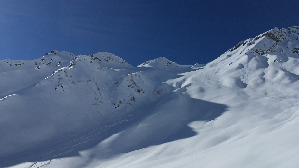 Nachdem ich die Sonne genossen hatte, zog ich meine Kurven durch den leicht krustigen Schnee die Südhänge hinunter und passierte problemlos das enge Couloir bei P.2360. Die weiteren Hänge waren ähnlich krustig, aber noch gut zu fahren. Nach einem kurzen Gegenanstieg erreichte die Scharte nördlich P.2211.