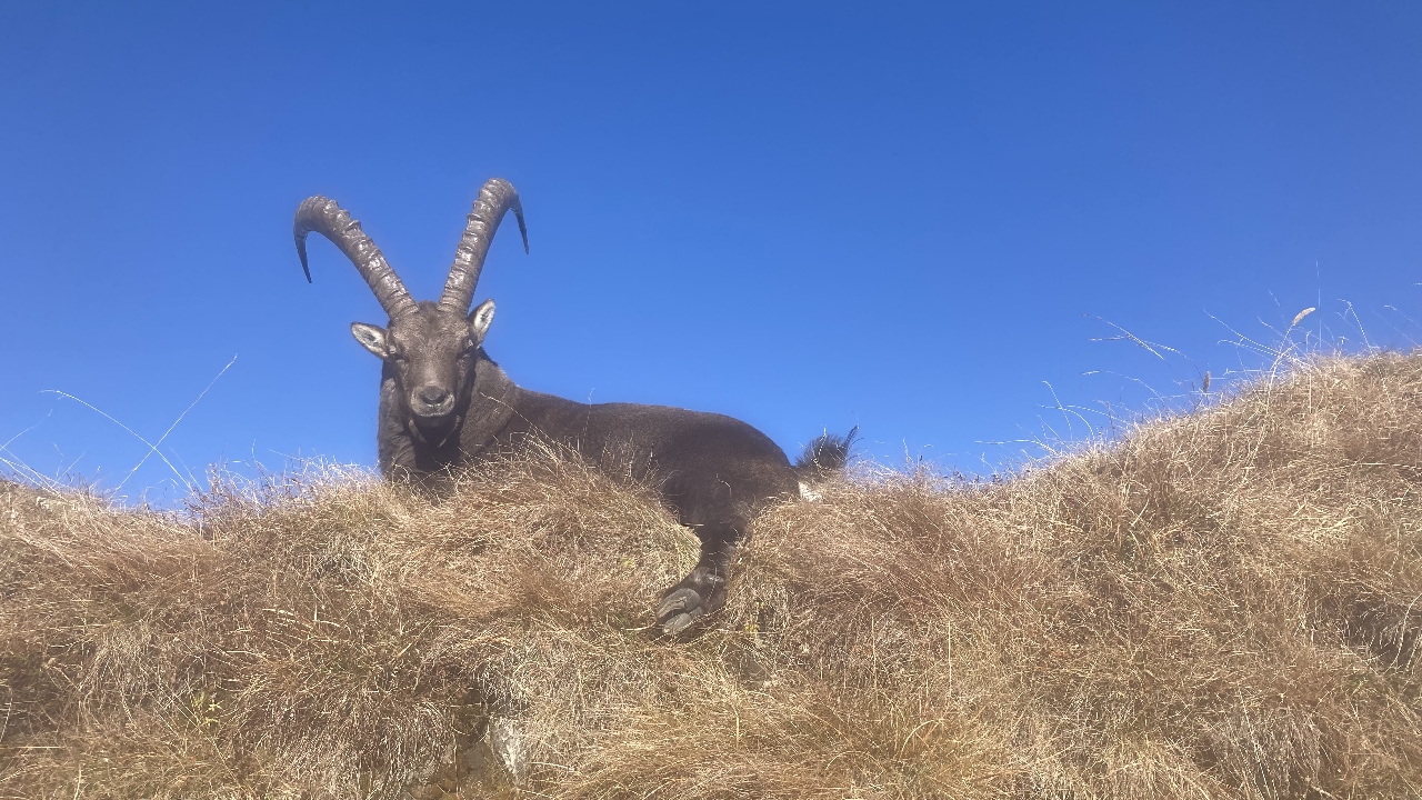 Jaaa, ein sehr reisserischer Titel, ich weiss. Aber als ich dem Steinbock auf dem Verbindungsgrat zwischen Tomlishorn und Widderfeldstock begegnete, kam mir genau dieser Gedanke. Der Kerl lag einige Meter über dem Weg in der Sonne, hatte ein Bein ausgestreckt und präsidierte gelassen über der Szenerie. Und nahm mit royaler Gleichgültigkeit meine Fotoaktivitäten hin.