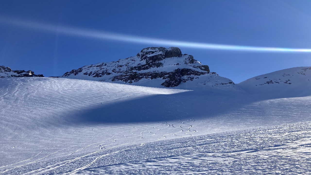 Der alte Bekannte dieser Tage – der kalte Südwestwind – liess mich nur kurz verweilen, bevor ich zum Sattel bei P.2776 zurückkehrte und mich hier in der Sonne erholte. Anschliessend zog ich meine Kurven durch den grossartigen Schnee den Gletscher hinab. Nach einem kurzen Gegenanstieg düste ich die Hänge am Firnbäch hinab, wo ich teils recht guten, teils sehr mühsamen, windgedeckelten Schnee vorfand. Auf der Forststrasse gelangte ich schliesslich wieder zum Ausgangspunkt zurück.