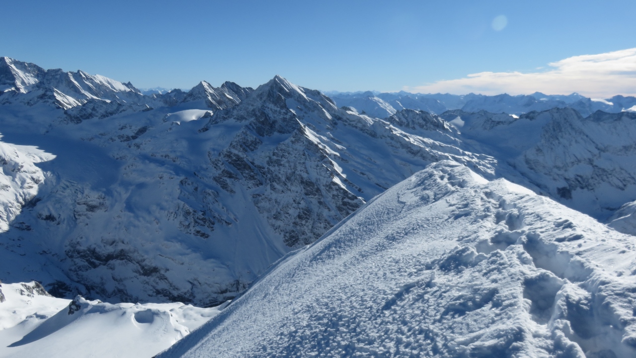 Am Gipfel genoss ich die Aussicht, allerdings war der eiskalte und starke Wind nicht so einladend. Und ausserdem wollte ich in die Abfahrt. Da alle anderen irgendwie lieber im kalten Wind sassen, stieg ich zügig wieder, sprang auf die Skier und düste die Hänge hinunter. Und obwohl ich die Tour sicherlich bereits fünf oder sechs Mal gemacht hatte, hatte ich jetzt zum ersten Mal tollen, 10-20cm tiefen Pulver in der Ruchchälen, von oben bis unten und weiter nach Brunni. Gut gelaunt und fröhlich fuhr ich die Forststrasse zum Auto zurück und freute mich über den Tag.